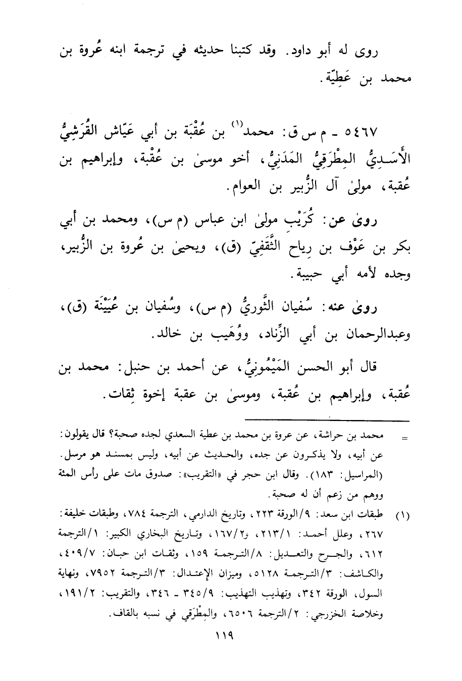 5467 - م س ق: مُحَمَّد بن عقبة بن أَبي عياش القرشي الأسدي المطرقي المدني (1) ، أخو مُوسَى بن عقبة، وإبراهيم بن عقبة، مولى آل الزبير بْن العوام.