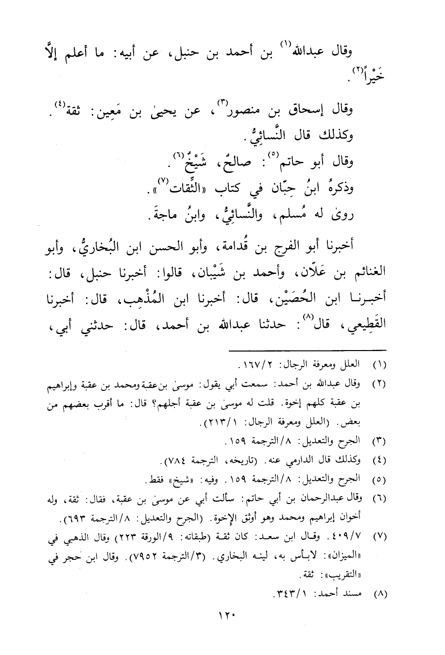 (2) وَقَال عَبد اللَّهِ بْن أَحْمَد: سمعت أبي يقول: مُوسَى بن عقبة ومحمد بن عقبة وإبراهيم بن عقبة كلهم إخوة. قلت له موسى بن عقبة أجلهم؟ قال: ما أقرب بعضهم من بعض. (العلل ومعرفة الرجال: 1 / 213) .