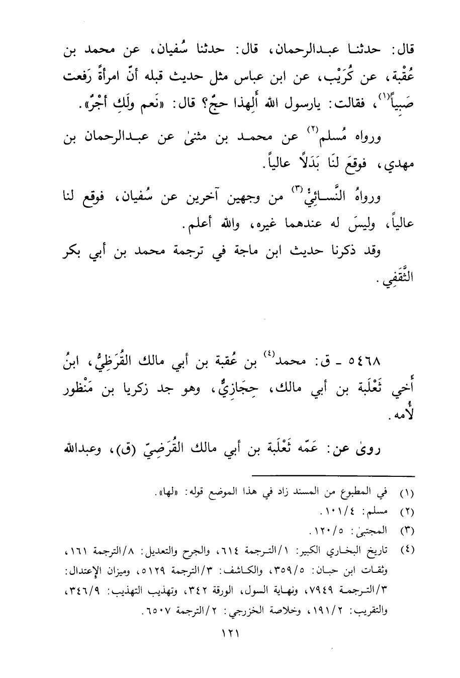 قال: حَدَّثَنَا عَبْدُ الرَّحْمَنِ، قال: حَدَّثَنَا سُفْيَانُ، عَنْ مُحَمَّدِ بْنِ عُقْبَةَ، عَنْ كُرَيْبٍ، عَنِ ابْنِ عَبَّاسٍ مِثْلَ حَدِيثٍ قَبْلَهُ أَنَّ امْرَأَةً رَفَعَتْ صَبِيًّا (1) ، فَقَالَتْ: يَا رَسُولَ اللَّهِ أَلِهَذَا حَجٌّ؟ قال: نَعَمْ ولَكِ أَجْرٌ.