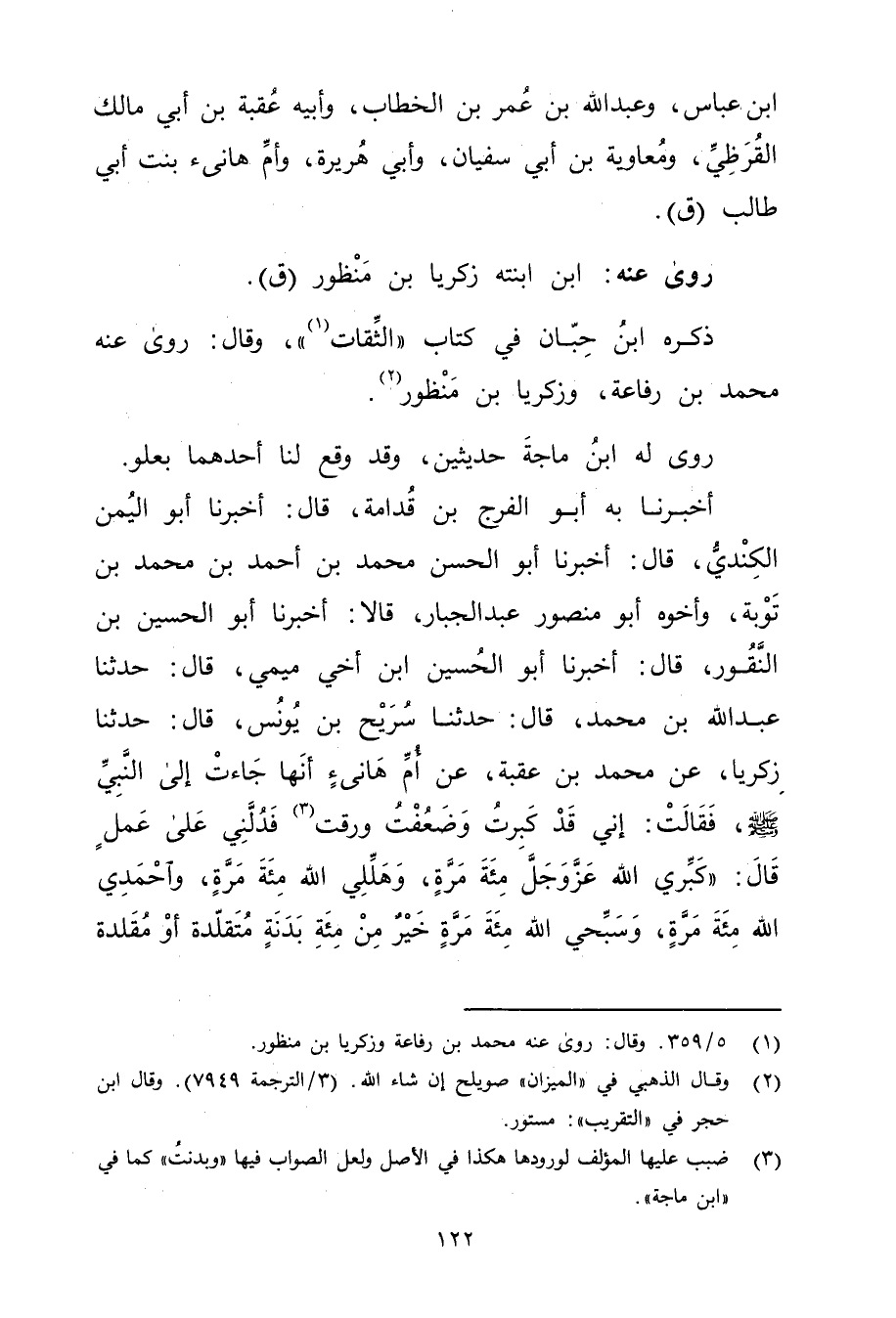أَخْبَرَنَا بِهِ أَبُو الْفَرَجِ بْنُ قُدَامَةَ، قال: أَخْبَرَنَا أَبُو اليُمْنِ الْكِنْدِيُّ، قال: أَخْبَرَنَا أبو الحسن مُحَمَّد بْن أحمد بْنِ مُحَمَّدِ بْنِ تَوْبَةَ، وأَخُوهُ أَبُو مَنْصُورٍ عَبْدُ الْجَبَّارِ، قَالا: أخبرنا أَبُو الحسين بْن النقور، قال: أخبرنا أَبُو الْحُسَيْنِ ابْنُ أَخِي مِيمِي، قال: حَدَّثَنَا عَبد اللَّهِ بْن مُحَمَّدٍ، قال: حَدَّثَنَا سُرَيْحُ بْنُ يُونُسَ، قال: حَدَّثَنَا زَكَرِيَّا، عَنْ مُحَمَّدِ بْنِ عُقْبَةَ، عَنْ أَمِّ هَانِئٍ أَنَّهَا جَاءَتْ إِلَى النَّبِيّ صَلَّى اللَّهُ عَلَيْهِ وسَلَّمَ، فَقَالَتْ: إِنِّي قَدْ كَبِرْتُ وضعفت ورقت (3) فَدُلَّنِي عَلَى عَمَلٍ قال: كَبِّرِي الله عزوجل مئة مرة، وهللي الله مئة مرة، وأَحمدي الله مئة مرة، وسبحي الله مئة مرة خير من مئة بدنة متقلدة أو مقلدة