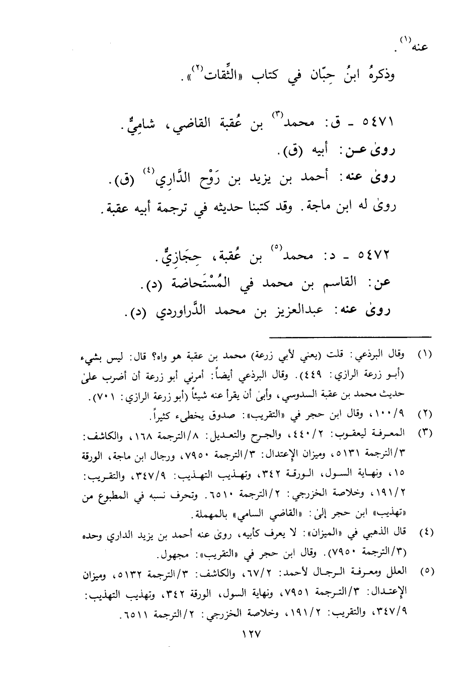 (1) وَقَال البرذعي: قلت (يعني لأبي زرعة) محمد بن عقبة هو واه؟ قال: ليس بشيءٍ (أبو زُرْعَة الرازي: 449) . وَقَال البرذعي أيضا: أمرني أبو زُرْعَة أن أضرب على حديث محمد بن عقبة السدوسي، وأبى أن يقرأ عنه شيئا (أبو زُرْعَة الرازي: 701) .