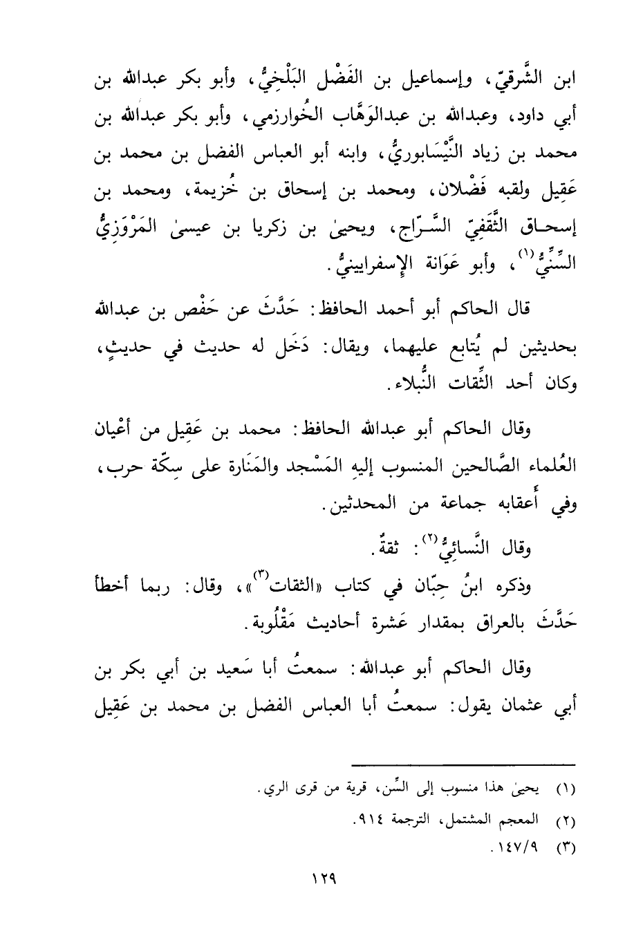 وَقَال الحاكم أَبُو عَبد اللَّهِ: سمعت أبا سَعِيد بن أَبي بكر بن أَبي عثمان يقول: سمعت أَبَا الْعَبَّاس الْفَضْل بْن محمد بن عقيل
