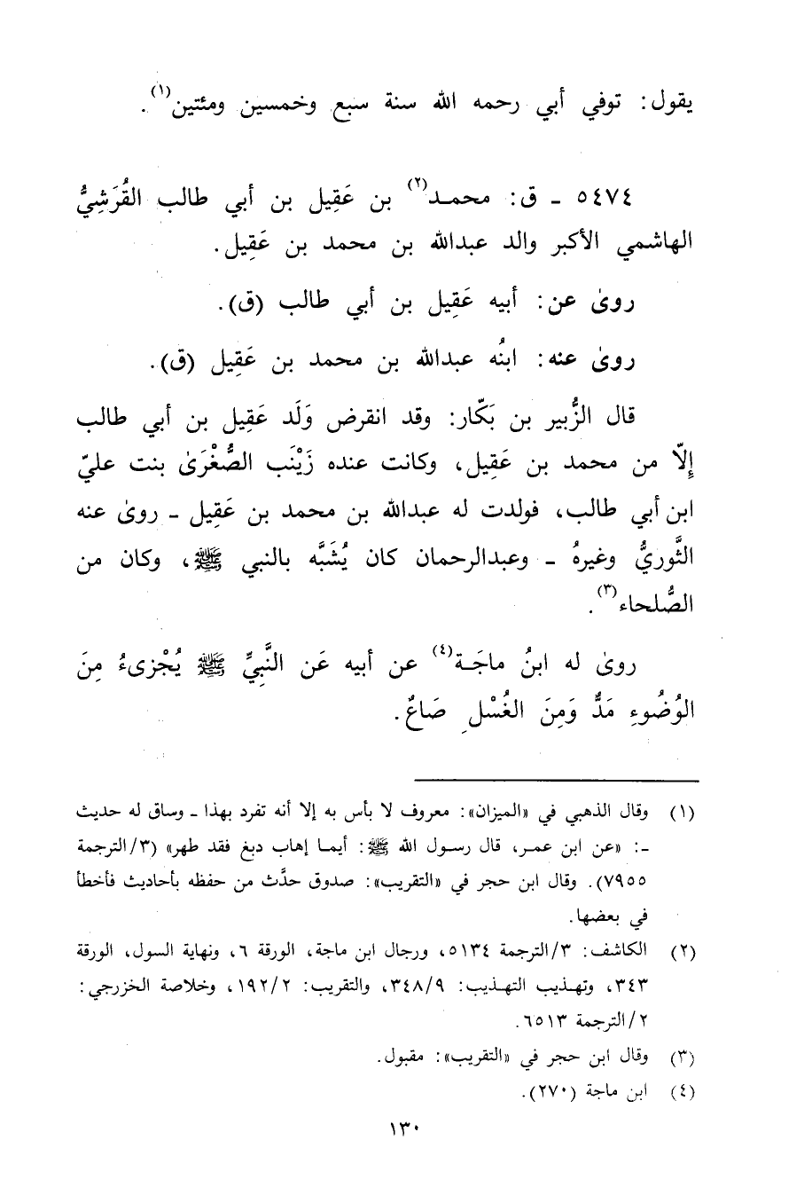 5474 - ق: مُحَمَّد بن عقيل بن أَبي طالب القرشي الهاشمي الأكبر والد عَبد اللَّه بْن مُحَمد بن عَقِيل (1) .