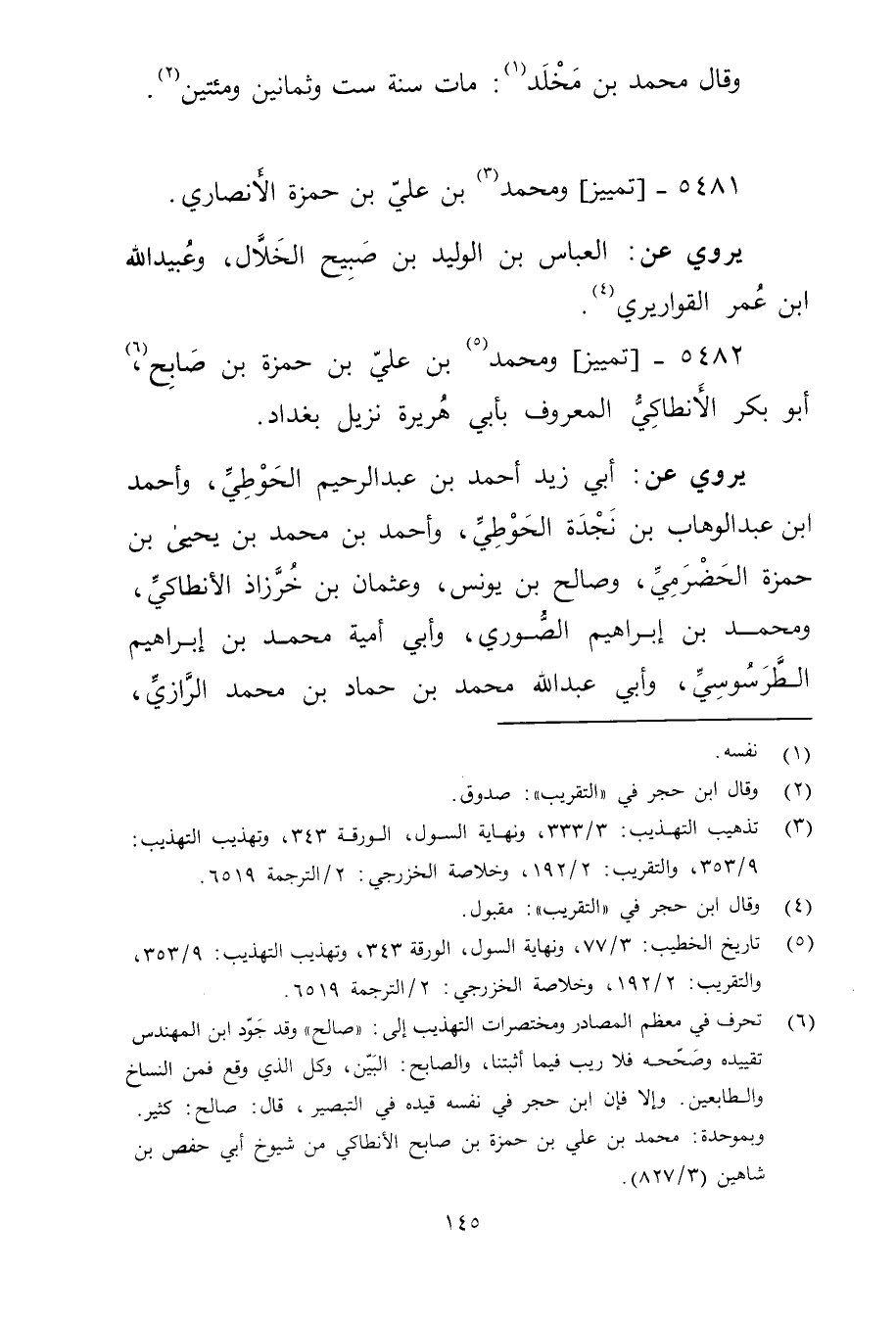 (5) تاريخ الخطيب: 3 / 77، ونهاية السول، الورقة 343، وتهذيب التهذيب: 9 / 353، والتقريب: 2 / 192، وخلاصة الخزرجي: 2 / الترجمة 6519.