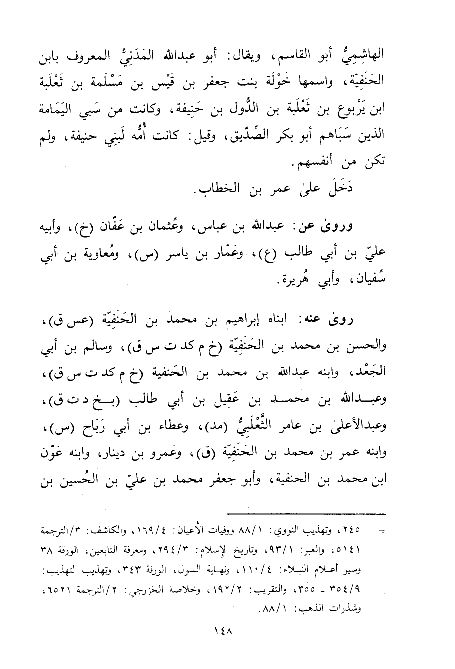 الهاشمي أبو القاسم، ويُقال: أبو عَبد اللَّهِ المدني المعروف بابن الحنفية، واسمها خولة بنت جعفر بن قيس بن مسلمة بن ثعلبة ابن يربوع بن ثعلبة بن الدول بن حنيفة، وكانت من سبي اليمامة الذين سباهم أَبُو بكر الصديق، وقيل: كانت أمة لبني حنيفة، ولم تكن من أنفسهم.
