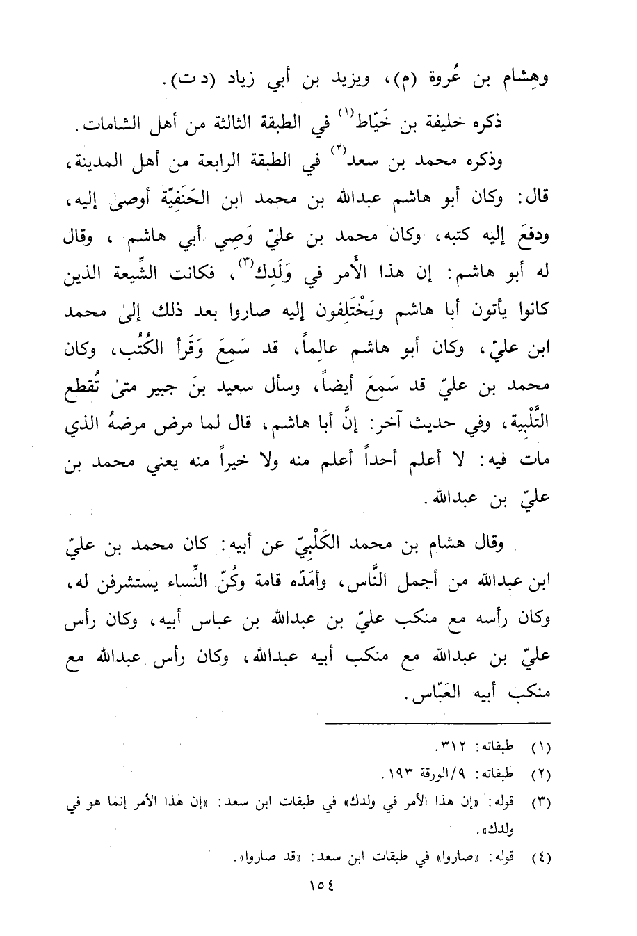 وذكره مُحَمَّد بْن سعد (2) في الطبقة الرابعة من أهل المدينة، قال: وكان أبو هاشم عَبد اللَّهِ بن مُحَمَّد ابن الحنفية أوصى إليه، ودفع إليه كتبه، وكان مُحَمَّد بن علي وصي أبي هاشم، وَقَال له أَبُو هاشم: إن هذا الأمر في ولدك (3) ، فكانت الشيعة الذين كانوا يأتون أبا هاشم ويختلفون إليه صاروا بعد ذلك إلى محمد ابن علي، وكان أَبُو هاشم عالما، قد سمع وقرأ الكتب، وكان مُحَمَّد بن علي قد سمع أيضا، وسأل سَعِيد بن جبير متى تقطع التلبية، وفي حديث آخر: إن أبا هاشم، قال لما مرض مرضه الذي مات فيه: لا أعلم أحدا أعلم منه ولا خيرا منه يعني مُحَمَّد بْن علي بْن عَبد الله.