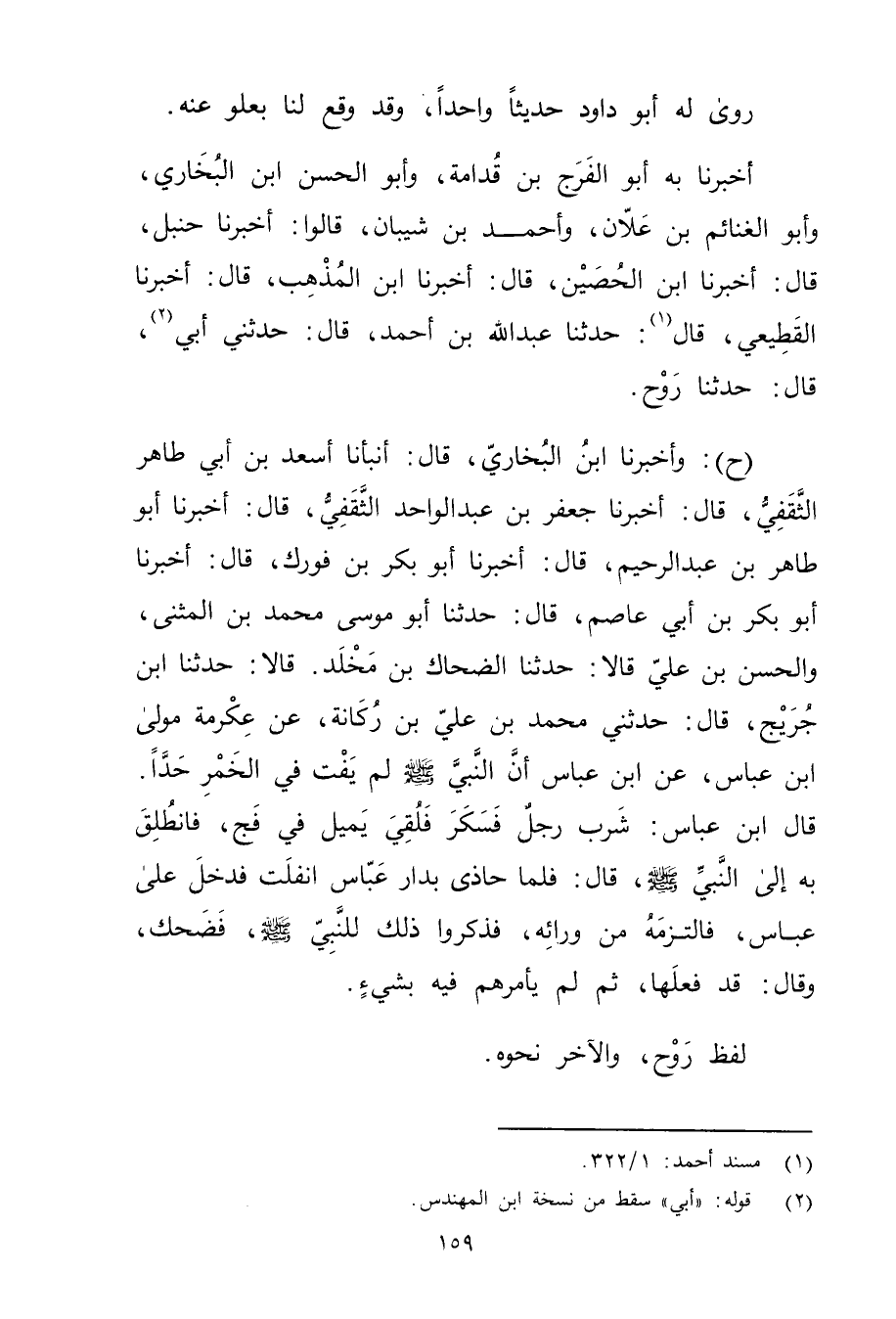 أَخْبَرَنَا بِهِ أَبُو الْفَرَجِ بْنُ قُدَامَةَ، وأَبُو الْحَسَنُ بْنُ الْبُخَارِيِّ، وأَبُو الْغَنَائِمِ بْن علان، وأحمد بْن شيبان، قَالُوا: أخبرنا حنبل، قال: أخبرنا ابْنُ الْحُصَيْنِ، قال: أخبرنا ابْنُ الْمُذْهِب، قال: أخبرنا القَطِيعِيّ، قال (1) : حَدَّثَنَا عَبد اللَّهِ بْنُ أَحْمَدَ، قال: حدثني أبي (2) ، قال: حَدَّثَنَا رَوْحٌ.