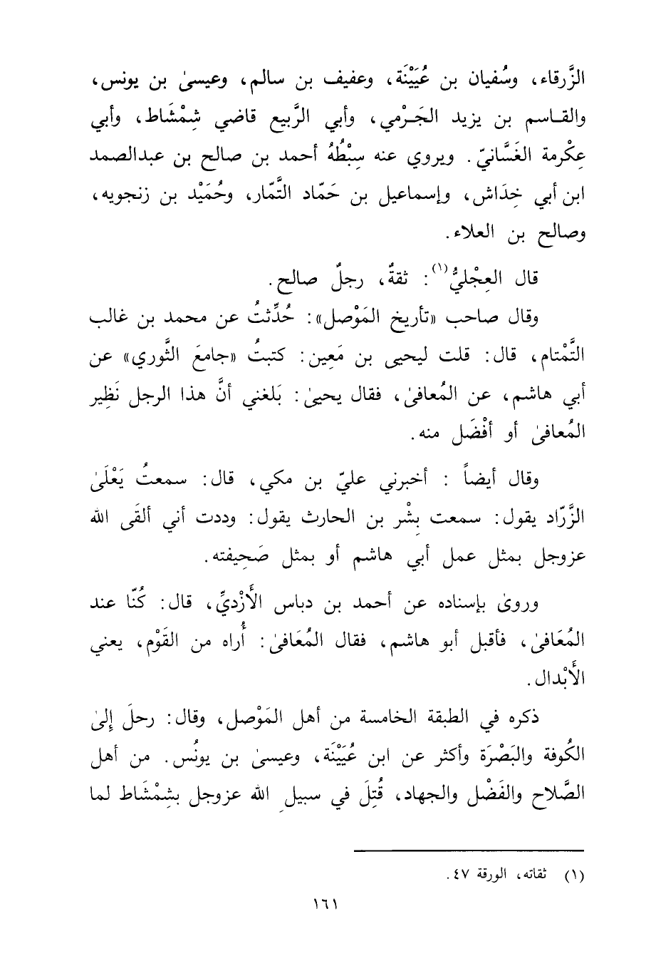 وَقَال صاحب "تأريخ الموصل ": حدثت عَنْ مُحَمَّدِ بْنِ غالب التمتام، قال: قلت ليحيى بن مَعِين: كتبت "جامع الثوري "عَن أبي هاشم، عن المعافى، فقال يحيى: بلغني أن هذا الرجل نظير المعافى أو أفضل منه.