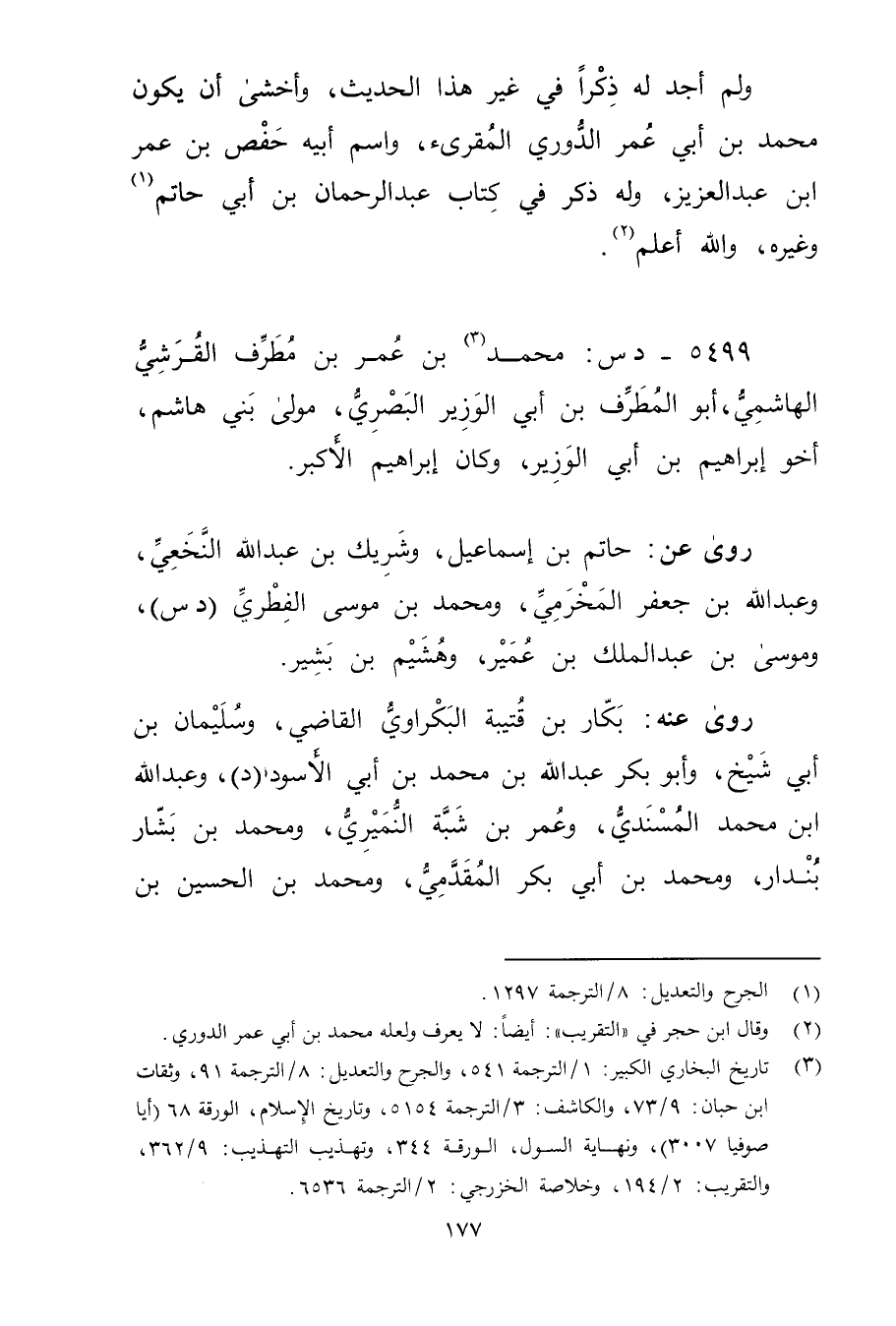 ولم أجد لَهُ ذكرا فِي غَيْرِ هَذَا الْحَدِيثِ، وأَخْشَى أَنْ يَكُونَ مُحَمَّدَ بْنَ أَبي عُمَر الدُّورِيَّ الْمُقْرِئَ، واسْمُ أَبِيهِ حَفْصُ بن عُمَر ابن عَبْدِ الْعَزِيزِ، ولَهُ ذِكْرٌ فِي كِتَابِ عَبْدِ الرَّحْمَنِ بْنِ أَبي حَاتِمٍ (1) وغَيْرِهِ، واللَّهُ أَعْلَمُ (2) .