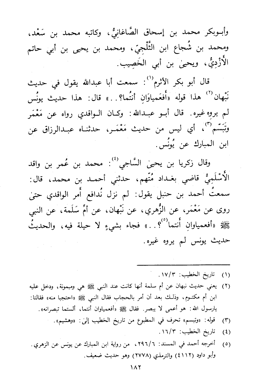 وَقَال زكريا بن يحيى الساجي (4) : مُحَمَّد بن عُمَر بن واقد الأَسلميّ قاضي بغداد متهم، حَدَّثَنِي أحمد بْن محمد، قال: سمعت أَحْمَد بْن حنبل يَقُول: لم نزل ندافع أمر الواقدي حتى روى عن معمر، عن الزُّهْرِيّ، عن نبهان، عن أم سلمة، عَنِ النبي صَلَّى اللَّهُ عَلَيْهِ وسَلَّمَ "أفعمياوان أنتما (5) ؟.."فجاء بشيءٍ لا حيلة فيه، والحديث حديث يونس لم يروه غيره.