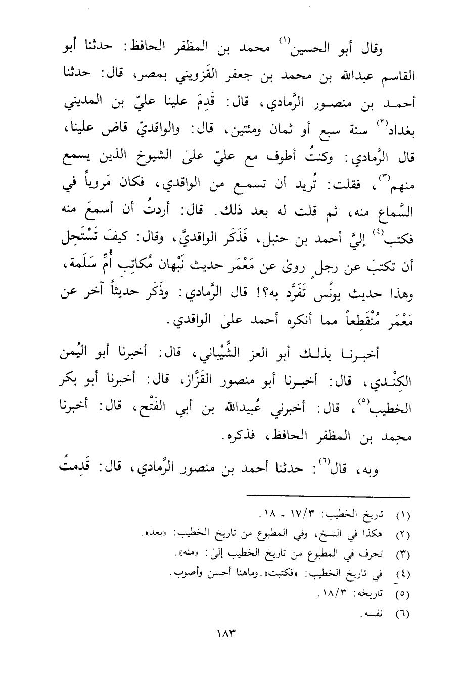 أَخْبَرَنَا بِذَلِكَ أَبُو الْعِزِّ الشَّيْبَانِيُّ، قال: أَخْبَرَنَا أَبُو اليُمْنِ الْكِنْدِيُّ، قال: أَخْبَرَنَا أَبُو مَنْصُورٍ الْقَزَّازُ، قال: أَخْبَرَنَا أَبُو بكر الخطيب (5) ، قال: أَخْبَرَنِي عُبَيد اللَّهِ بْنُ أَبي الْفَتْحِ، قال: أَخْبَرَنَا مُحَمَّد بْن المظفر الْحَافِظُ، فَذَكَرَهُ.