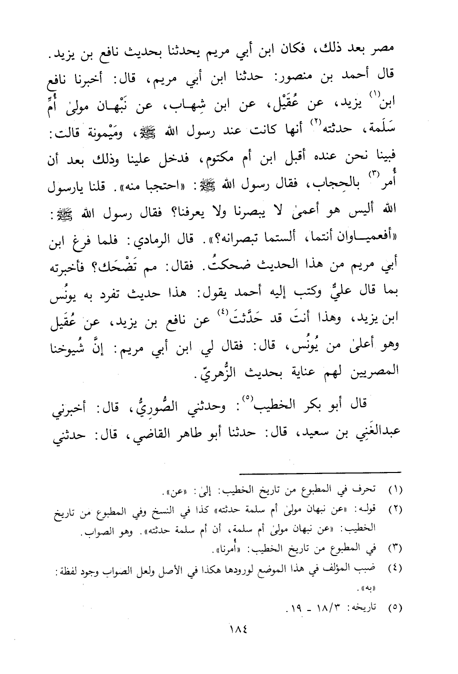 مِصْرَ بَعْدَ ذَلِكَ، فَكَانَ ابْنُ أَبي مَرْيَمَ يحَدَّثَنَا بِحَدِيثِ نَافِعِ بْنِ يَزِيدَ. قال أَحْمَدُ بْنُ مَنْصُورٍ: حَدَّثَنَا ابْنُ أَبي مَرْيَمَ، قال: أخبرنا نافع ابن (1) يَزِيدَ، عَنْ عُقَيْلٍ، عَنِ ابْنِ شِهَابٍ، عَنْ نَبْهَانَ مَوْلَى أُمِّ سَلَمَةَ، حَدَّثَتْهُ (2) أَنَّهَا كَانَتْ عِنْدَ رَسُول اللَّهِ صلى الله عليه وسَلَّمَ، ومَيْمُونَةَ قَالَتْ: فَبَيَّنَا نَحْنُ عِنْدَهُ أَقْبَلَ ابْنُ أُمِّ مَكْتُومٍ، فَدَخَلَ عَلَيْنَا وذَلِكَ بَعْدَ أَنْ أُمِرَ (3) بِالْحِجَابِ، فَقَالَ رَسُولُ اللَّهِ صَلَّى اللَّهُ عَلَيْهِ وسَلَّمَ: "احْتَجِبَا مِنْهُ ". قُلْنَا يَا رَسُولَ اللَّهِ أَلَيْسَ هُوَ أَعْمَى لا يُبْصِرُنَا ولا يَعْرِفُنَا؟ فَقَالَ رَسُولُ اللَّهِ صَلَّى اللَّهُ عَلَيْهِ وسَلَّمَ: "أفعمياوان أَنْتُمَا، أَلَسْتُمَا تُبْصِرَانِهِ؟ ". قال الرَّمَادِيُّ: فَلَمَّا فَرَغَ ابْنُ أَبي مَرْيَمَ مِنْ هَذَا الْحَدِيثِ ضَحِكْتُ. فَقَالَ: مِمَّ تَضْحَكُ؟ فَأَخْبَرْتُهُ بِمَا قال علي وكتب إِلَيْهِ أَحْمَدُ يَقُولُ: هَذَا حَدِيثٌ تفرد به يونس ابن يَزِيدَ، وهَذَا أَنْتَ قَدْ حَدَّثْتَ (4) عن نافع بن يَزِيدَ، عن عُقَيْلٍ وهُوَ أَعْلَى مِنْ يُونُسَ، قال: فَقَالَ لِي ابْنُ أَبي مَرْيَمَ: إِنَّ شُيُوخَنَا المِصْرِيين لَهُمْ عِنَايَةٌ بِحَدِيثِ الزُّهْرِيّ.