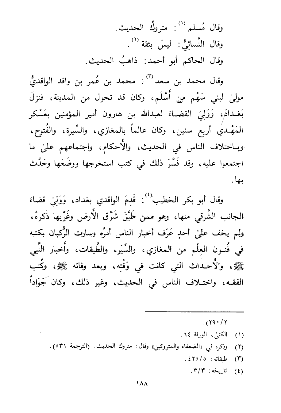 وَقَال مُحَمَّد بْن سَعْد (3) : مُحَمَّد بْن عُمَر بن واقد الواقدي مولى لبني سهم من أسلم، وكان قد تحول من المدينة، فنزل بغداد، وولي القضاء لعبد الله بن هَارُونَ أمير المؤمنين بعسكر المهدي أربع سنين، وكان عالما بالمغازي، والسيرة، والفتوح، وباختلاف الناس في الحديث، والأحكام، واجتماعهم على ما اجتمعوا عليه، وقد فسر ذلك في كتب استخرجها ووضعها وحدث بها.