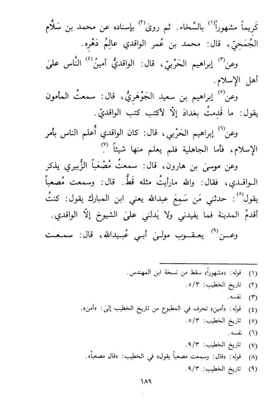 وعن مُوسَى بن هَارُونَ، قال: سمعت مصعبا الزبيري يذكر الواقدي، فقال: والله ما رأيت مثله قط. قال: وسمعت مصعبا يقول (8) : حَدَّثَنِي من سمع عَبْد اللَّهِ يعني ابن المبارك يقول: كنت أقدم المدينة فما يفيدني ولا يدلني على الشيوخ إلا الواقدي.