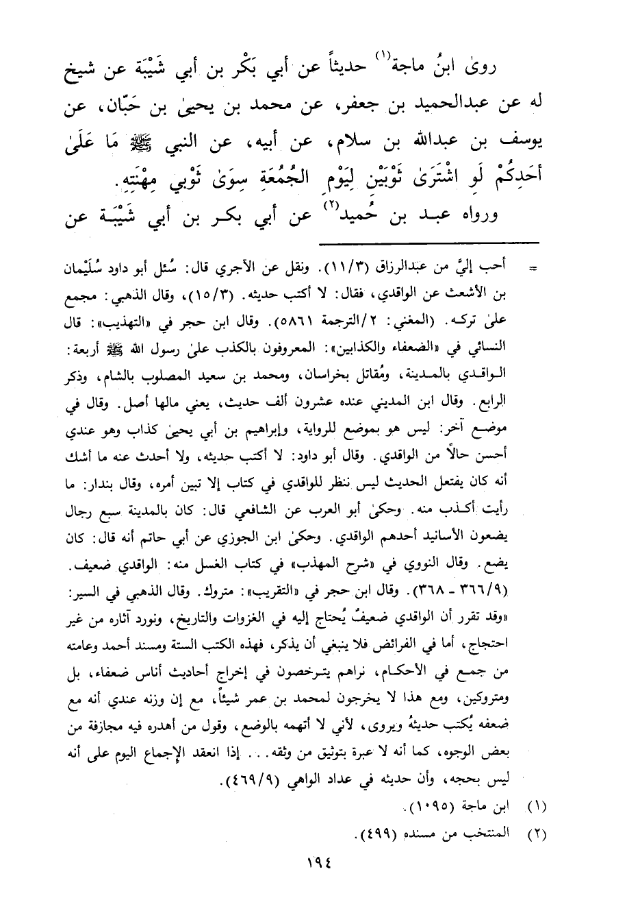 "وقد تقرر أن الواقدي ضعيف يحتاج إليه في الغزوات والتاريخ، ونورد آثاره من غير احتجاج، أما في الفرائض فلا ينبغي أن يذكر، فهذه الكتب الستة ومسند أحمد وعامته من جمع في الاحكام، نراهم يترخصون في إخراج أحاديث أناس ضعفاء، بل ومتروكين، ومع هذا لا يخرجون لمحمد بن عُمَر شيئا، مع إن وزنه عندي أنه مع ضعفه يكتب حديثه ويروى، لاني لا أتهمه بالوضع، وقول من أهدره فيه مجازفة من بعض الوجوه، كما أنه لا عبرة بتوثيق من وثقه ... إذا انعقد الاجماع اليوم على أنه ليس بحجه، وأن حديثه في عداد الواهي (9 / 469) .
