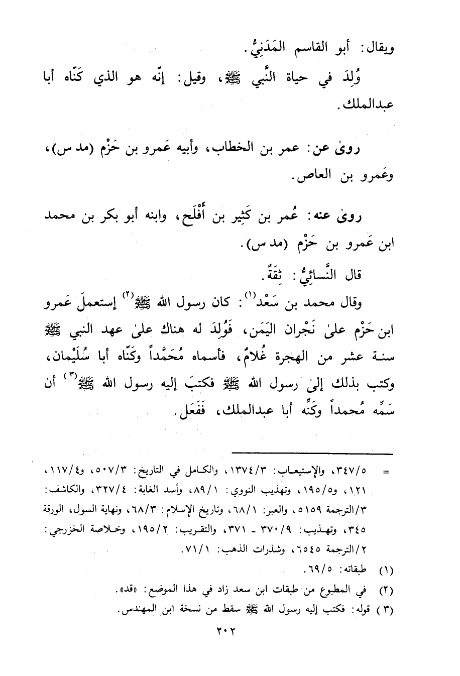 وَقَال مُحَمَّد بن سعد (1) : كان رَسُول اللَّهِ صَلَّى اللَّهُ عليه وسلم (2) استعمل عَمْرو ابن حزم على نجران اليمن، فولد له هناك على عهد النبي صَلَّى اللَّهُ عَلَيْه وسَلَّمَ سنة عشر من الهجرة غلام، فاسماه محمدا وكناه أبا سُلَيْمان، وكتب بذلك إلى رَسُول اللَّهِ صَلَّى اللَّهُ عَلَيْهِ وسَلَّمَ فَكَتَبَ إِلَيْهِ رَسُول اللَّهِ صلى الله عليه وسلم (3) أن سمه محمدا وكنه أبا عَبد المَلِك، ففعل.