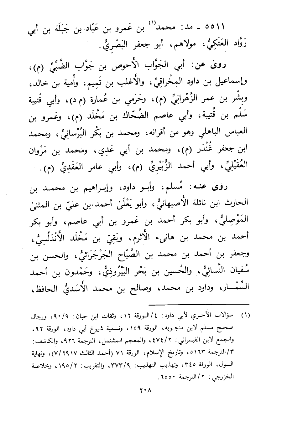 (1) سؤالات الآجري لابي داود: 4 / الورقة 12، وثقات ابن حبان: 9 / 90، ورجال صحيح مسلم لابن منجويه، الورقة 159، وتسمية شيوخ أبي داود، الورقة 92، والجمع لابن القيسراني: 2 / 474، والمعجم المشتمل، الترجمة 926، والكاشف: 3 / الترجمة 5163، وتاريخ الاسلام، الورقة 71 (أحمد الثالث 2917 / 7) ، ونهاية السول، الورقة 345، وتهذيب التهذيب: 9 / 373، والتقريب: 2 / 195، وخلاصة الخزرجي: 2 / الترجمة 6550.