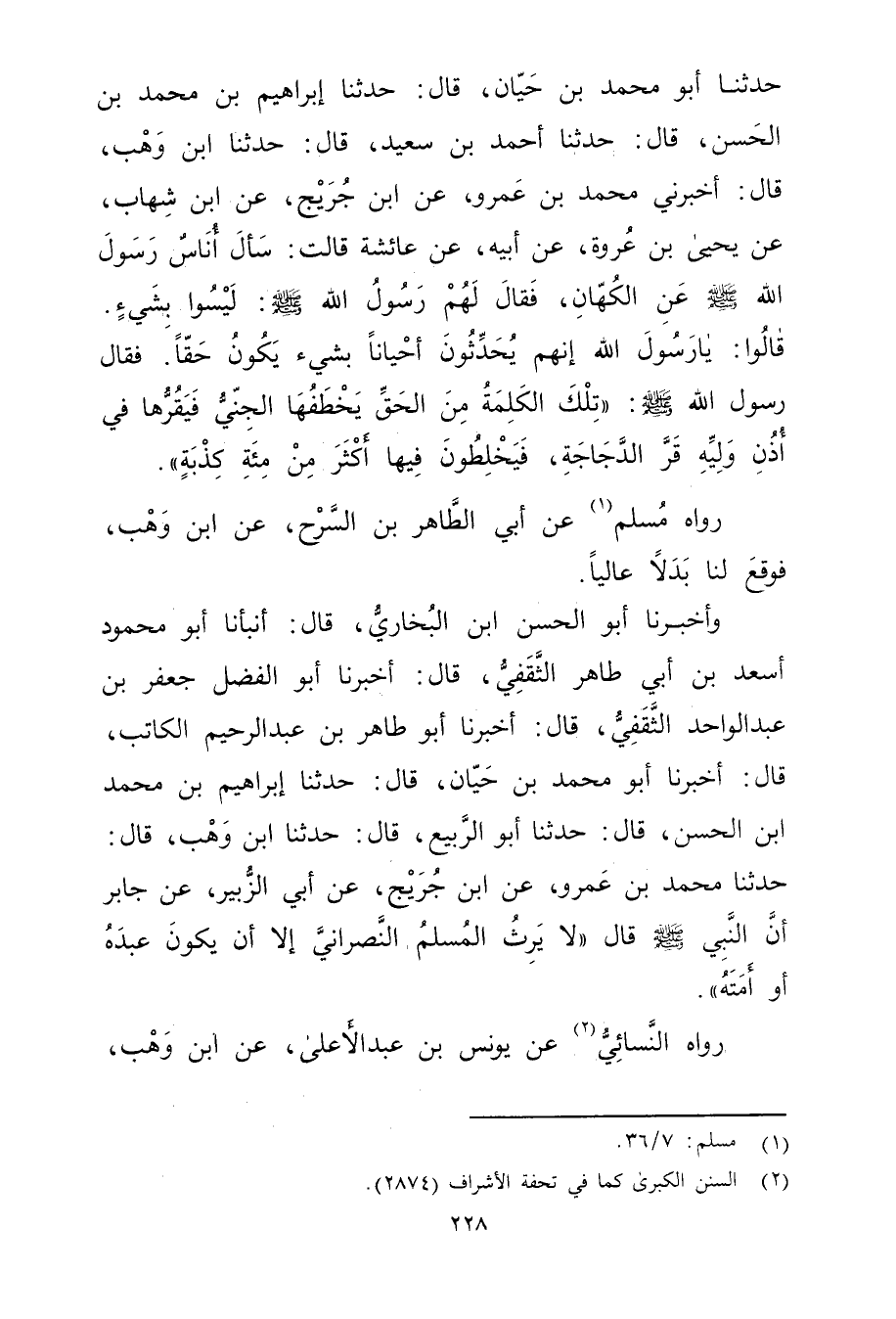 حَدَّثَنَا أَبُو مُحَمَّد بْن حيان، قال: حَدَّثَنَا إِبْرَاهِيمُ بْنُ مُحَمَّدِ بْنِ الْحَسَنِ، قال: حَدَّثَنَا أَحْمَدُ بْنُ سَعِيد، قال: حَدَّثَنَا ابْنُ وهْبٍ، قال: أَخْبَرَنِي مُحَمَّدُ بْنُ عَمْرو، عَنِ ابْنِ جُرَيْج، عَنِ ابْنِ شِهَابٍ، عَنْ يَحْيَى بْنِ عُرْوَةَ، عَن أَبِيهِ، عَنْ عَائِشَةَ قَالَتْ: سَأَلَ أُنَاسٌ رَسُولَ اللَّهِ صَلَّى اللَّهُ عَلَيْهِ وسَلَّمَ عَن الْكُهَّانِ، فَقَالَ لَهُمْ رَسُولُ اللَّهِ صَلَّى اللَّهُ عَلَيْهِ وسَلَّمَ: لَيْسُوا بشيءٍ. قَالُوا: يَا رَسُولَ اللَّهِ إِنَّهُمْ يُحَدِّثُونَ أَحْيَانًا بشيءٍ يَكُونُ حَقًّا. فَقَالَ رَسُولُ اللَّهِ صَلَّى اللَّهُ عَلَيْهِ وسَلَّمَ: "تِلْكَ الْكَلِمَةُ مِنَ الْحَقِّ يَخْطَفُهَا الْجِنِّيُّ فَيَقُرُّهَا فِي أُذُنِ ولِيِّهِ قَرَّ الدَّجَاجَةِ، فيخلطون فيها أكثر من مئة كَذِبَةٍ.