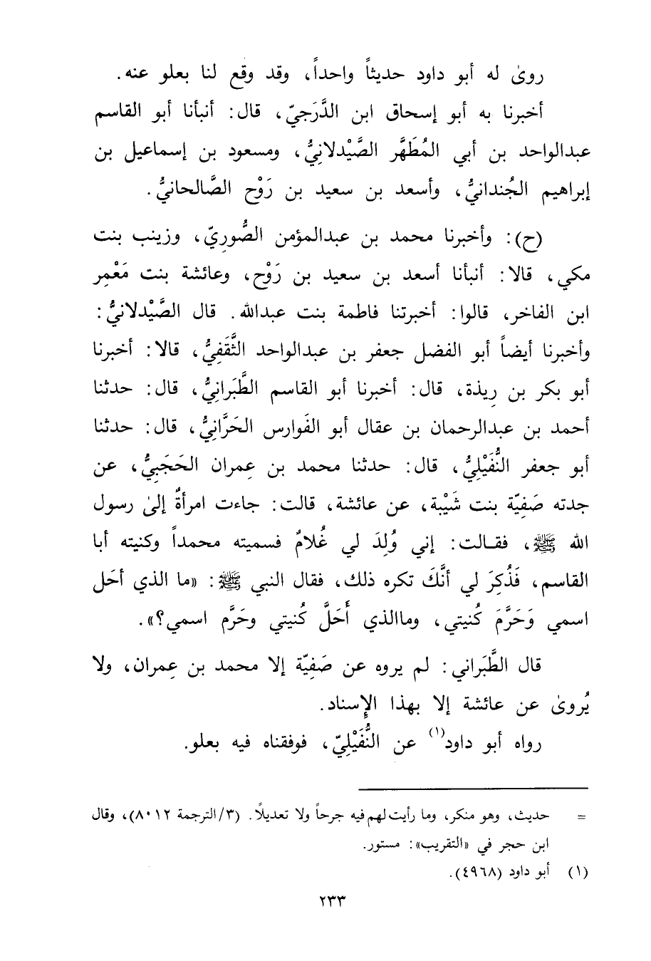 (ح) : وأخبرنا محمد بن عبد المؤمن الصُّورِيُّ، وزَيْنَبُ بِنْتُ مَكِّيٍّ، قَالا: أَنْبَأَنَا أَسْعَدُ بْنُ سَعِيد بْنِ روح، وعائشة بنت معمر ابن الْفَاخِرِ، قَالُوا: أَخْبَرَتْنَا فَاطِمَةُ بِنْتُ عَبد اللَّهِ. قال الصَّيْدَلانِيُّ: وأَخْبَرَنَا أَيْضًا أَبُو الْفَضْلِ جَعْفَرُ بْنُ عَبْدِ الْوَاحِدِ الثَّقَفِيُّ، قَالا أَخْبَرَنَا أَبُو بَكْرِ بْنُ رِيذَةَ قال: أخبرنا أَبُو الْقَاسِمِ الطَّبَرَانِيُّ، قال: حَدَّثَنَا أَحْمَدُ بْنُ عَبْدِ الرَّحْمَنِ بْنِ عِقَالٍ أَبُو الْفَوَارِسِ الْحَرَّانِيُّ، قال: حَدَّثَنَا أَبُو جَعْفَرٍ النُّفَيْلِيُّ، قال: حَدَّثَنَا مُحَمَّدُ بْنُ عِمْران الْحَجَبِيُّ، عَنْ جَدَّتِهِ صَفِيَّةَ بِنْتِ شَيْبَة، عَنْ عَائِشَةَ، قَالَتْ: جَاءَتِ امرأة إِلَى رَسُول اللَّهِ صَلَّى اللَّهُ عَلَيْهِ وسَلَّمَ، فَقَالَتْ: إِنِّي ولِدَ لِي غُلامٌ فَسَمَّيْتُهُ مُحَمَّدًا وكَنَّيْتُهُ أَبَا الْقَاسِمِ، فَذُكِرَ لِي أَنَّكَ تَكْرَهُ ذَلِكَ، فَقَالَ النَّبِيُّ صلى الله عليه وسلم: "ما الَّذِي أَحَلَّ اسْمِي وحَرَّمَ كُنْيَتِي، ومَا الَّذِي أَحَلَّ كُنْيَتْيِ وحَرَّمَ اسْمِي؟.