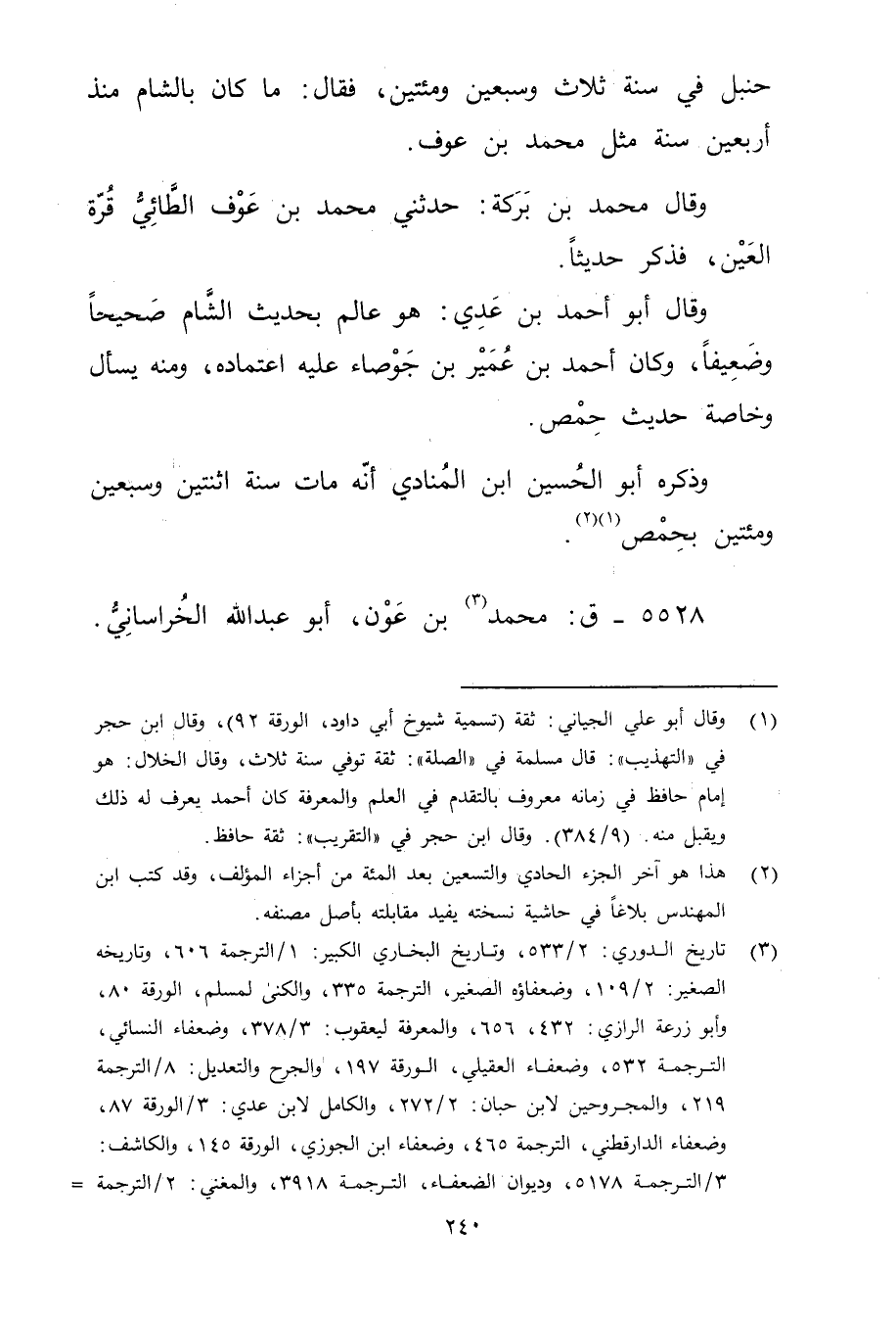 حنبل في سنة ثلاث وسبعين ومئتين، فقال: ما كان بالشام منذ أربعين سنة مثل مُحَمَّد بن عوف.