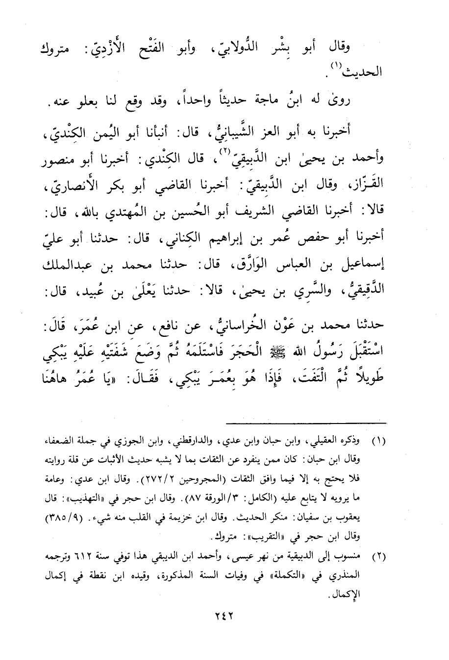 أَخْبَرَنَا بِهِ أَبُو الْعِزِّ الشَّيْبَانِيُّ، قال: أَنْبَأَنَا أَبُو اليُمْنِ الْكِنْدِيُّ، وأَحْمَدُ بن يحيى ابن الدَّبِيقِيِّ (2) ، قال الْكِنْدِيُّ: أَخْبَرَنَا أَبُو مَنْصُورٍ الْقَزَّازُ، وَقَال ابْنُ الدَّبِيقِيِّ: أَخْبَرَنَا الْقَاضِي أَبُو بكر الأَنْصارِيّ، قَالا: أَخْبَرَنَا الْقَاضِي الشَّرِيفُ أَبُو الحسين بْن المهتدي بالله، قال: أَخْبَرَنَا أَبُو حَفْص عُمَر بْن إِبْرَاهِيمَ الْكِنَانِيُّ، قال: حَدَّثَنَا أَبُو علي إسماعيل بن العباس الوارق، قال: حَدَّثَنَا مُحَمَّدُ بْنُ عَبد المَلِك الدَّقِيقِيُّ، والسَّرِيُّ بْنُ يَحْيَى، قَالا: حَدَّثَنَا يَعْلَى بْنُ عُبَيد، قال: حَدَّثَنَا مُحَمَّدُ بْنُ عَوْنٍ الْخُرَاسَانِيُّ، عَنْ نَافِعٍ، عَنِ ابْنِ عُمَر، قال: اسْتَقْبَلَ رَسُولُ اللَّهِ صَلَّى اللَّهُ عَلَيْهِ وسَلَّمَ الْحَجَرَ فَاسْتَلَمَهُ ثُمَّ وضَعَ شَفَتَيْهِ عَلَيْهِ يَبْكِي طَوِيلا ثُمَّ الْتَفَتَ، فَإِذَا هُوَ بعُمَر يَبْكِي، فَقَالَ: "يَا عُمَر هاهنا