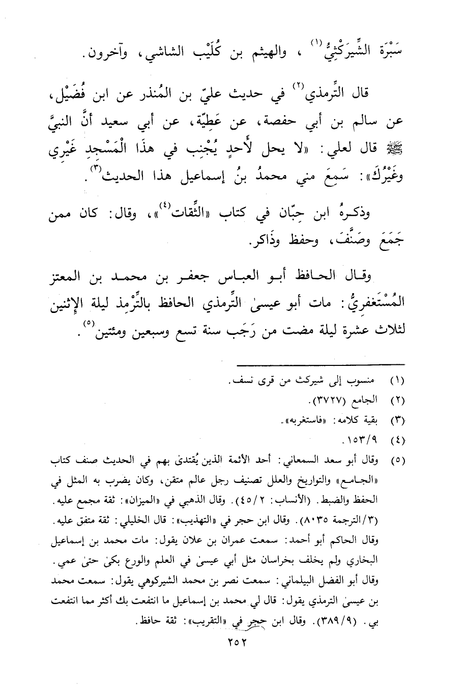 (الانساب: 2 / 45) . وَقَال الذهبي في "الميزان ": ثقة مجمع عليه. (3 / الترجمة 8035) . وَقَال ابن حجر في "التهذيب ": قال الخليلي: ثقة متفق عليه. وَقَال الحاكم أَبُو أحمد: سمعت عِمْران بن علان يقول: مات مُحَمَّد بْن إِسْمَاعِيل الْبُخَارِيّ ولم يخلف بخراسان مثل أبي عيسى في العلم والورع بكى حتى عمي. وَقَال أبو الفضل البيلماني: سمعت نصر بن محمد الشيركوهى يقول: سمعت محمد بن عيسى التِّرْمِذِيّ يقول: قال لي محمد بن إسماعيل ما انتفعت بك أكثر مما انتفعت بي. (9 / 389) . وَقَال ابن حجر في "التقريب": ثقة حافظ.