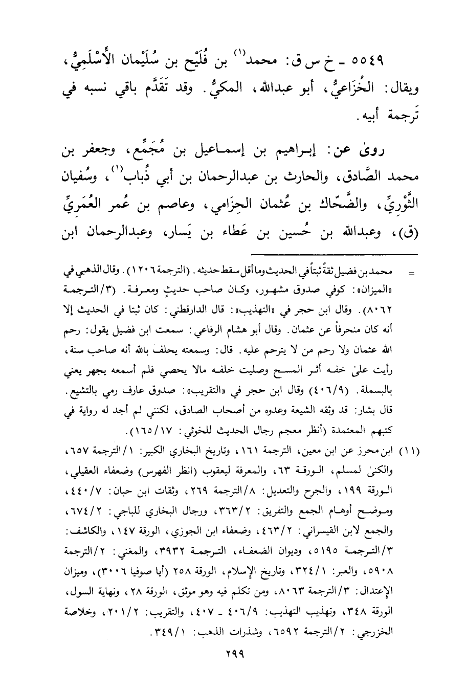 (1) ابن محرز عن ابن مَعِين، الترجمة 161، وتاريخ البخاري الكبير: 1 / الترجمة 657، والكنى لمسلم، الورقة 63، وضعفاء العقيلي، الورقة 199، والجرح والتعديل: 8 / الترجمة 269، وثقات ابن حبان: 7 / 440، وموضح أوهام الجمع والتفريق: 2 / 363، ورجال البخاري للباجي: 2 / 674، والجمع لابن القيسراني: 2 / 463، وضعفاء ابن الجوزي، الورقة 147، والكاشف: 3 / الترجمة 5195، وديوان الضعفاء، الترجمة 3932، والمغني: 2 / الترجمة 5908، والعبر: 1 / 324، وتاريخ الاسلام، الورقة 258 (أيا صوفيا 3006) ، وميزان الاعتدال: 3 / الترجمة 8063، ومن تكلم فيه وهو موثق، الورقة 28، ونهاية السول، الورقة 348، وتهذيب التهذيب: 9 / 406 - 407، والتقريب: 2 / 201، وخلاصة الخزرجي: 2 / الترجمة 6592، وشذرات الذهب: 1 / 349.
