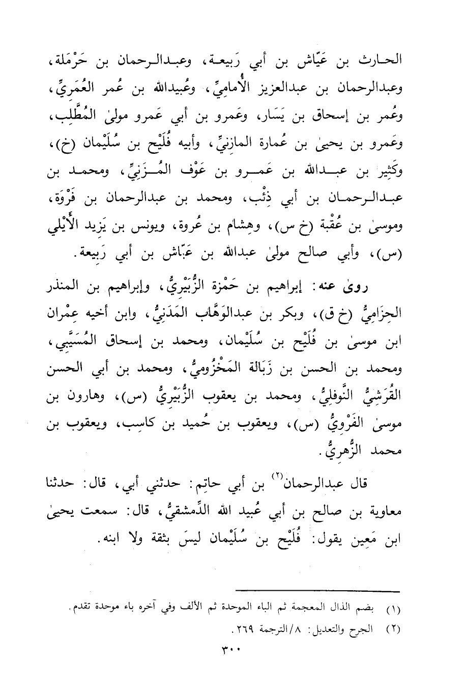 قال عَبْد الرَّحْمَنِ بْن أَبي حاتم: حَدَّثني أَبِي، قال: حَدَّثَنَا معاوية بن صالح بن أَبي عُبَيد الله الدمشقي، قال: سمعت يحيى ابن مَعِين يقول: فليح بن سُلَيْمان ليس بثقة ولا ابنه (1) .