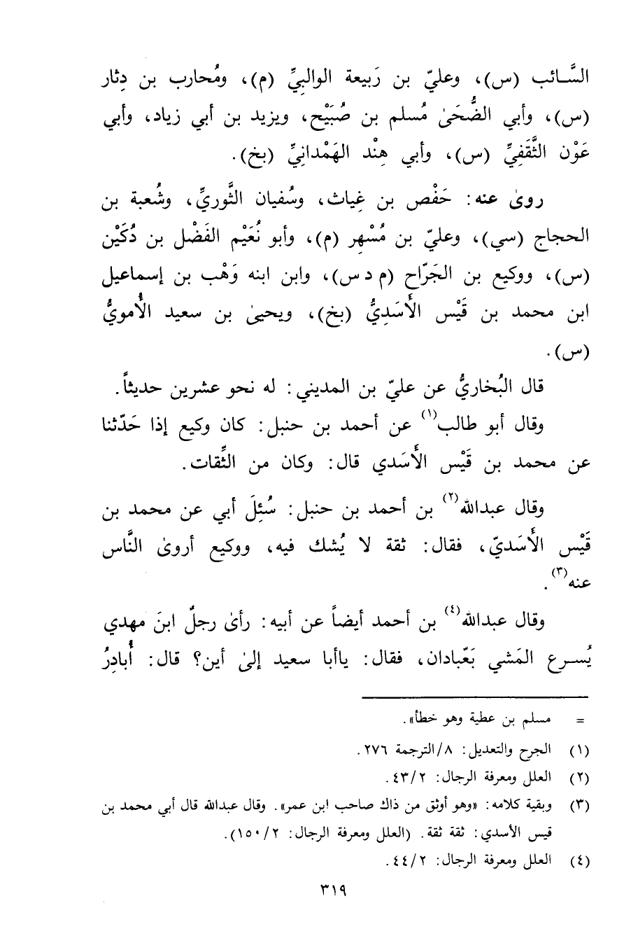 (3) وبقية كلامه: "وهو أوثق من ذاك صاحب ابن عُمَر ". وَقَال عَبد اللَّه قال أبي محمد بن قيس الأسدي: ثقة ثقة. (العلل ومعرفة الرجال: 2 / 150) .