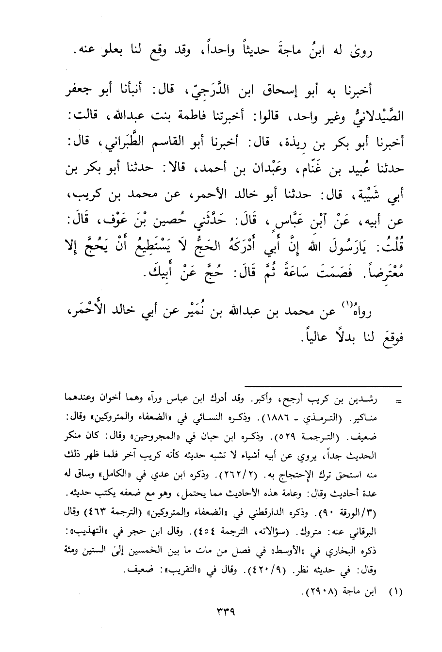 أَخْبَرَنَا بِهِ أَبُو إِسْحَاقَ ابْنُ الدَّرَجِيِّ، قال: أَنْبَأَنَا أَبُو جَعْفَرٍ الصَّيْدَلانِيُّ وغَيْرُ واحِدٍ، قَالُوا: أَخْبَرَتْنا فَاطِمَةُ بِنْتُ عَبد اللَّهِ، قَالَتْ: أخبرنا أَبُو بَكْرِ بْنُ رِيذَةَ، قال: أخبرنا أَبُو الْقَاسِمِ الطَّبَرَانِيُّ، قال: حَدَّثَنَا عُبَيد بْنُ غَنَّامٍ، وعَبْدَانُ بْنُ أَحْمَدَ، قَالا: حَدَّثَنَا أَبُو بَكْر بْن أَبي شَيْبَة، قال: حَدَّثَنَا أَبُو خَالِدٍ الأَحْمَرُ، عَنْ مُحَمَّدِ بْنِ كُرَيْبٍ، عَن أبيه، عن ابن عباس، قال: حَدَّثَنِي حُصَيْنُ بْنُ عَوْفٍ، قال: قُلْتُ: يَا رَسُولَ اللَّهِ إِنَّ أَبِي أَدْرَكَهُ الْحَجُّ لا يَسْتَطِيعُ أَنْ يَحُجَّ إِلا مُعْتَرِضًا. فَصَمَتَ سَاعَةً ثُمَّ قال: حُجَّ عَن أَبِيكَ.