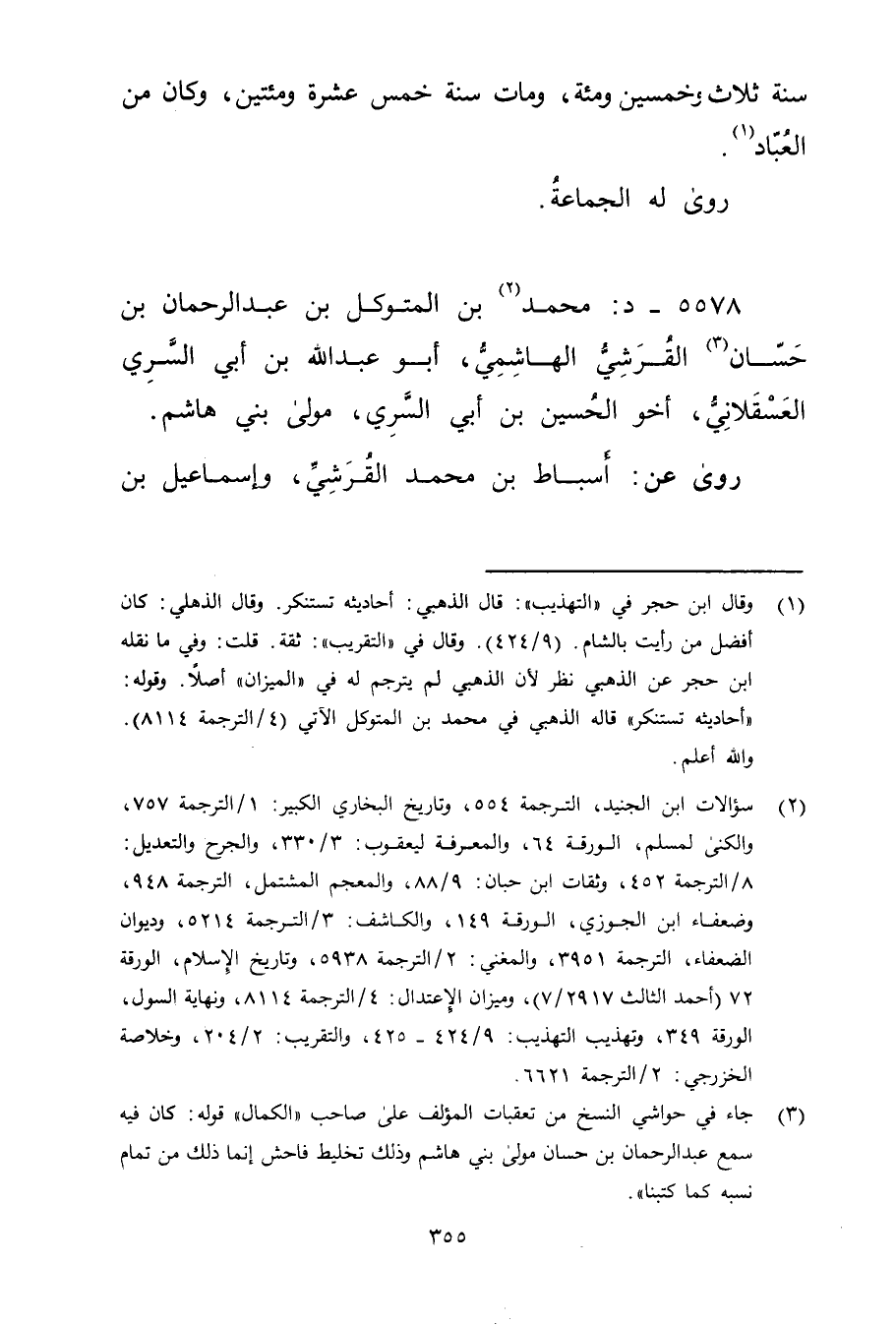 (3) جاء في حواشي النسخ من تعقبات المؤلف على صاحب "الكمال "قوله: كان فيه سمع عبد الرحمن بن حسان مولى بني هاشم وذلك تخليط فاحش إنما ذلك من تمام نسبه كما كتبنا ".