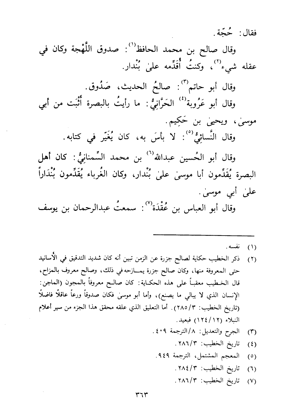 (2) ذكر الخطيب حكاية لصالح جزرة عن الزمن تبين أنه كان شديد التدقيق في الأسانيد حتى المعرفة منها، وكان صالح جزرة يمازحه في ذلك، وصالح معروف بالمزاح، قال الخطيب معقبا على هذه الحكاية: كان صالح معروفا بالمجون (الماجن: الانسان الذي لا يبالي ما يصنع) ، وأما أبو موسى فكان صدوقا ورعا عاقلا فاضلا (تاريخ الخطيب: 3 / 285) . أما التعليق الذي علقه محقق هذا الجزء من سير أعلام النبلاء (12 / 124) فبعيد.