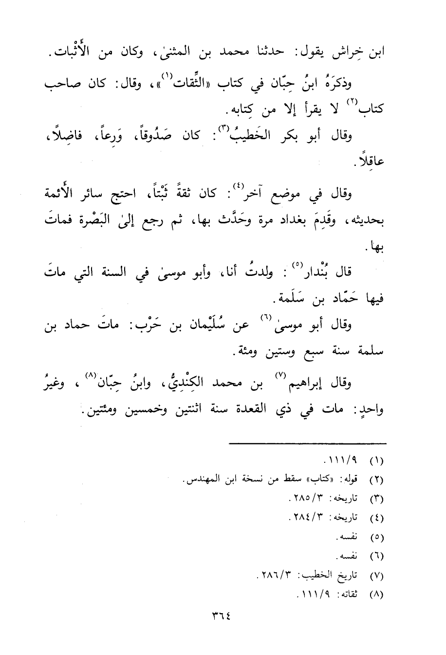 قال بندار (5) : ولدت أنا، وأَبُو مُوسَى في السنة التي مات فيها حماد بن سلمة.