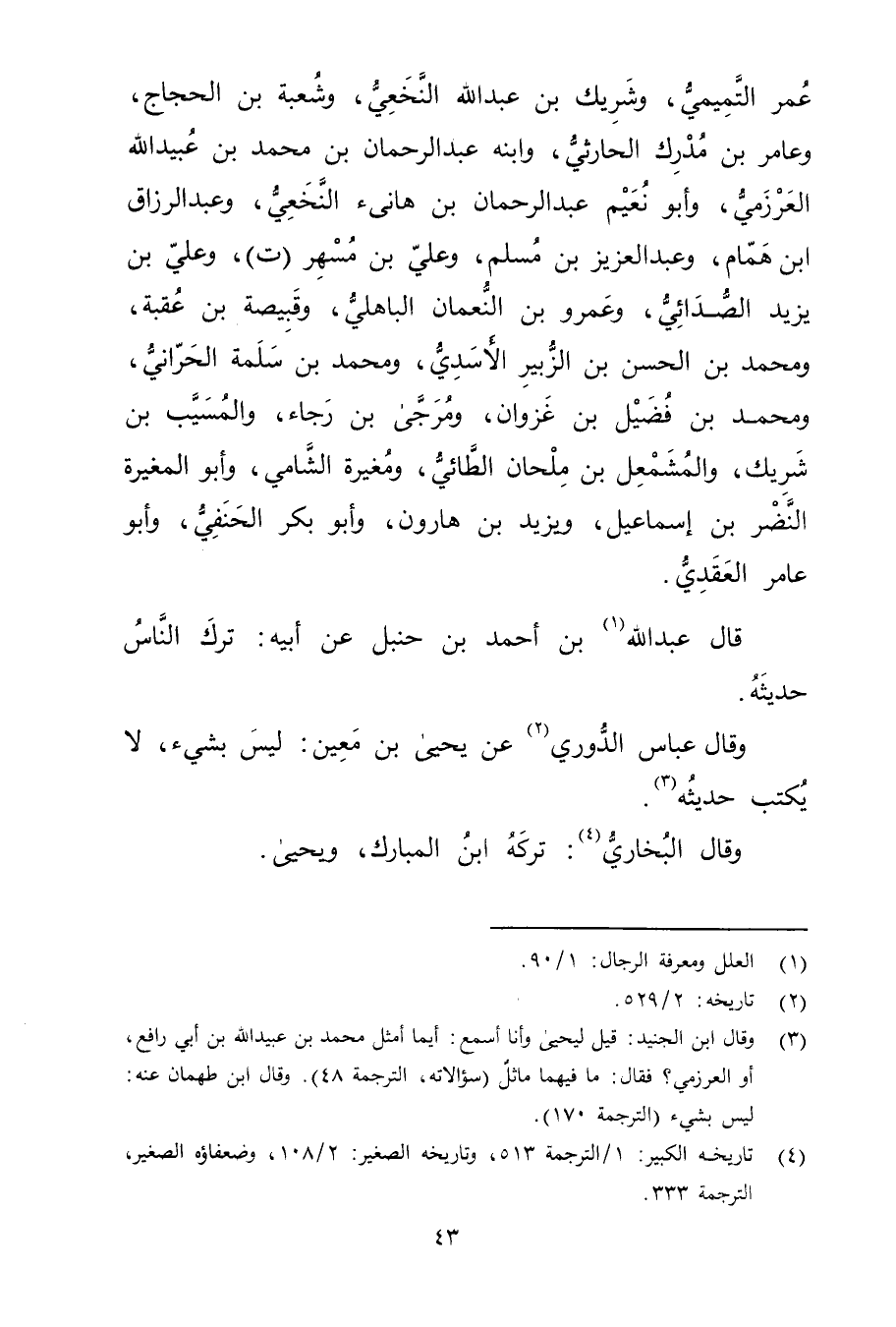(4) تاريخه الكبير: 1 / الترجمة 513، وتار يخه الصغير: 2 / 108، وضعفاؤه الصغير، الترجمة 333.