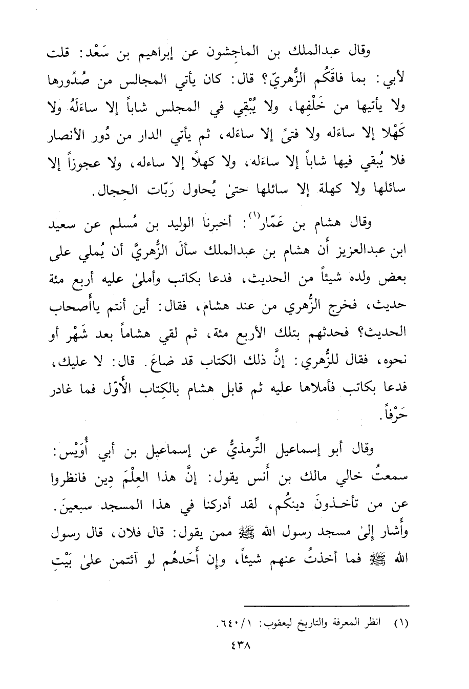 وَقَال عَبد المَلِك بْن الماجشون عن إبراهيم بن سعد: قلتُ لأبي: بما فاقكم الزُّهْرِيّ؟ قال: كان يأتي المجالس من صدورها ولا يأتيها من خلفها، ولا يبقى في المجلس شابا إلا ساءله ولا كهلا إلا ساءله ولا فتى إلا ساءله، ثم يأتي الدار من دور الأنصار فلا يبقى فيها شابا إلا ساءله، ولا كهلا إلا ساءله، ولا عجوزا إلا سائلها ولا كهلة إلا سائلها حتى يحاول ربات الحجال.