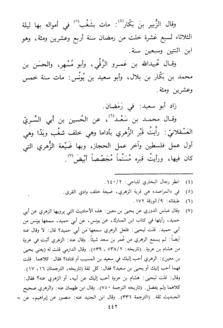 (7) وَقَال عَباس الدُّورِيُّ عَن يحيى بن مَعِين: هذه الاحاديث التي يرويها الزُّهْرِيّ عَن أبي حميد، رأيتها في كتاب ابْن المبارك، عن يونس، عَن أبي حميد سمعها يونس من أبي حميد. قلت ليحيى: فلعل الزُّهْرِيّ سمعها من أبي حميد؟ قال: لا وَقَال عنه ايضا: لم يسمع الزُّهْرِيّ من عُمَر بن سعد شيئا. وَقَال عَنه: الزُّهْرِيّ أثبت في عروة من هشام بن عروة. (تاريخه: 2 / 538 - 539) .