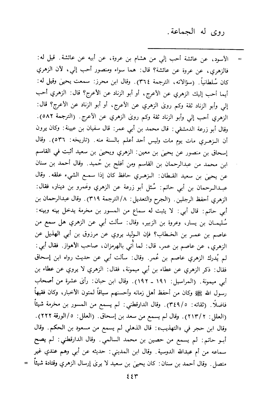 (تاريخه: 536) . وَقَال إسحاق بن منصور عن يحيى بن مَعِين: الزُّهْرِيّ ويحيى بن سَعِيد أثبت في القاسم ابن محمد بن عبد الرحمن بن القاسم ومن أفلح بن حميد. وَقَال أحمد بن سنان عن يحيى بن سَعِيد القطان: الزُّهْرِيّ حافظ كان إذا سمع الشئ علقه. وَقَال عبد الرحمن بن أَبي حاتم: سئل أبو زُرْعَة عن الزُّهْرِيّ وعَمْرو بن دينار، فقال: الزُّهْرِيّ أحفظ الرجلين. (الجرح والتعديل: 8 / الترجمة 319) . وَقَال عبد الرحمن بن أَبي حاتم: قال أبي: لا يثبت له سماع من المسور بن مخرمة يدخل بينه وبينه: سُلَيْمان بن يسار، وعروة بن الزبير، وَقَال: سَأَلتُ أبي عن الزُّهْرِيّ هل سمع من عاصم بن عُمَر بن الخطاب؟ فإن الوليد يروي عن مرزوق بن أَبي الهذيل عن الزُّهْرِيّ، عن عاصم بن عُمَر، قال: لما أتي بالهرمزان، صاحب الاهواز. فقال أبي: لم يدرك الزُّهْرِيّ عاصم بن عُمَر. وَقَال: سَأَلتُ أبي عن حديث رواه ابن إسحاق فقال: ذكر الزُّهْرِيّ عن عطاء بن أَبي ميمونة، فقال: الزُّهْرِيّ لا يروي عن عطاء بن أَبي ميمونة. (المراسيل: 191 - 192) . وَقَال ابن حبان: رأى عشرة من أصحاب رسول الله صلى الله عليه وسلم وكان من أحفظ أهل زمانه وأحسنهم سياقا لمتون الأخبار، وكان فقيها فاضلا. (ثقاته: 5 / 349) . وَقَال الدَّارَقُطْنِيُّ: لم يسمع من المسور بن مخرمة شيئا (العلل: 2 / 213) . وَقَال لم يسمع من سعد بن إسحاق. (العلل: 5 / الورقة 222) . وَقَال ابن حجر في "التهذيب ": قال الذهلي لم يسمع من مسعود بن الحكم. وَقَال أبو حاتم: لم يسمع من حصين بن محمد السالمي.