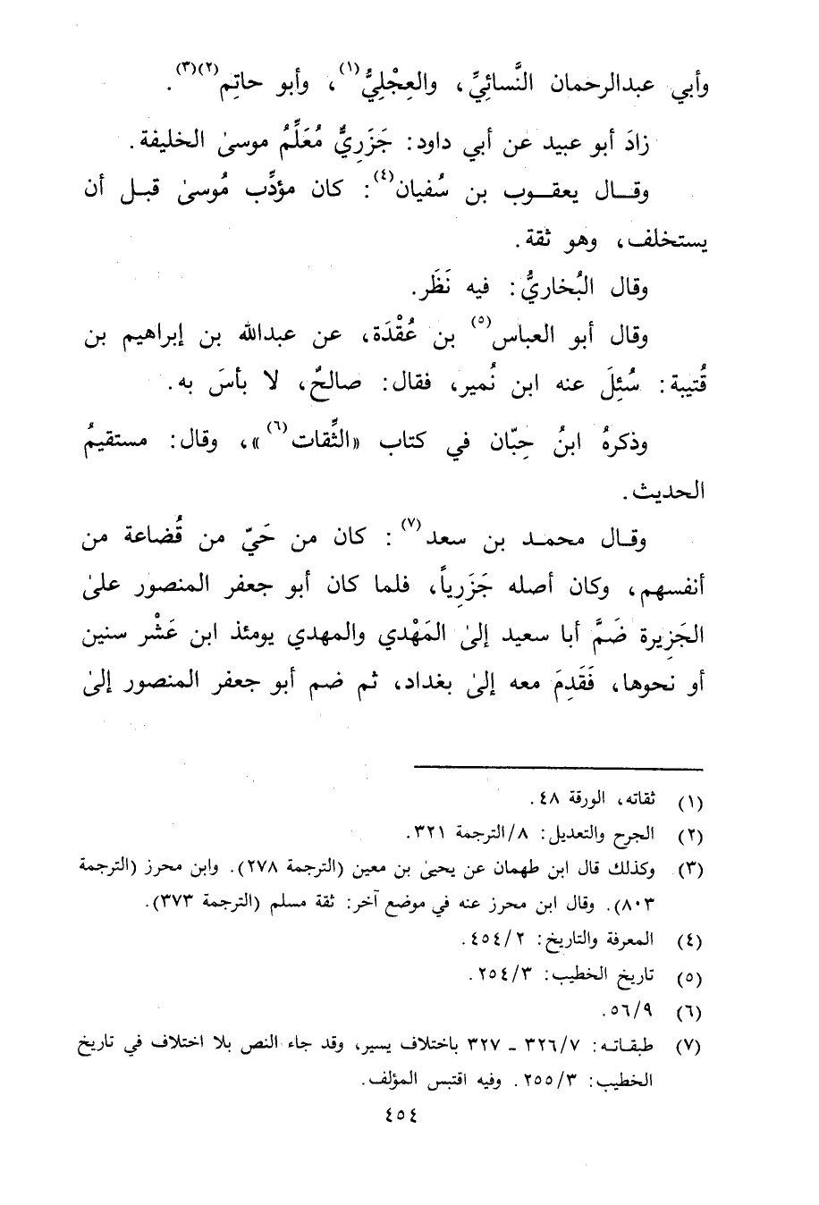 (7) طبقاته: 7 / 326 - 327 باختلاف يسير، وقد جاء النص بلا اختلاف في تاريخ الخطيب: 3 / 255. وفيه اقتبس المؤلف.