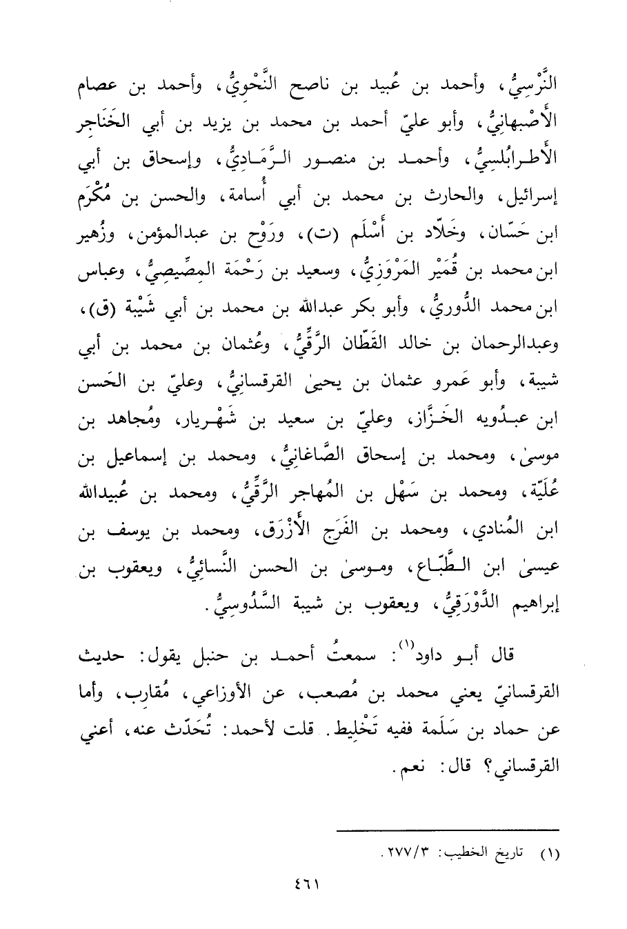 قال أَبُو داود (1) : سمعت أحمد بْن حنبل يقول: حديث القرقساني يعني مُحَمَّد بن مصعب، عن الأَوزاعِيّ، مقارب، وأما عن حماد بن سلمة ففيه تخليط. قلت لأحمد: تحدث عَنْهُ، أعني القرقساني؟ قال: نعم.