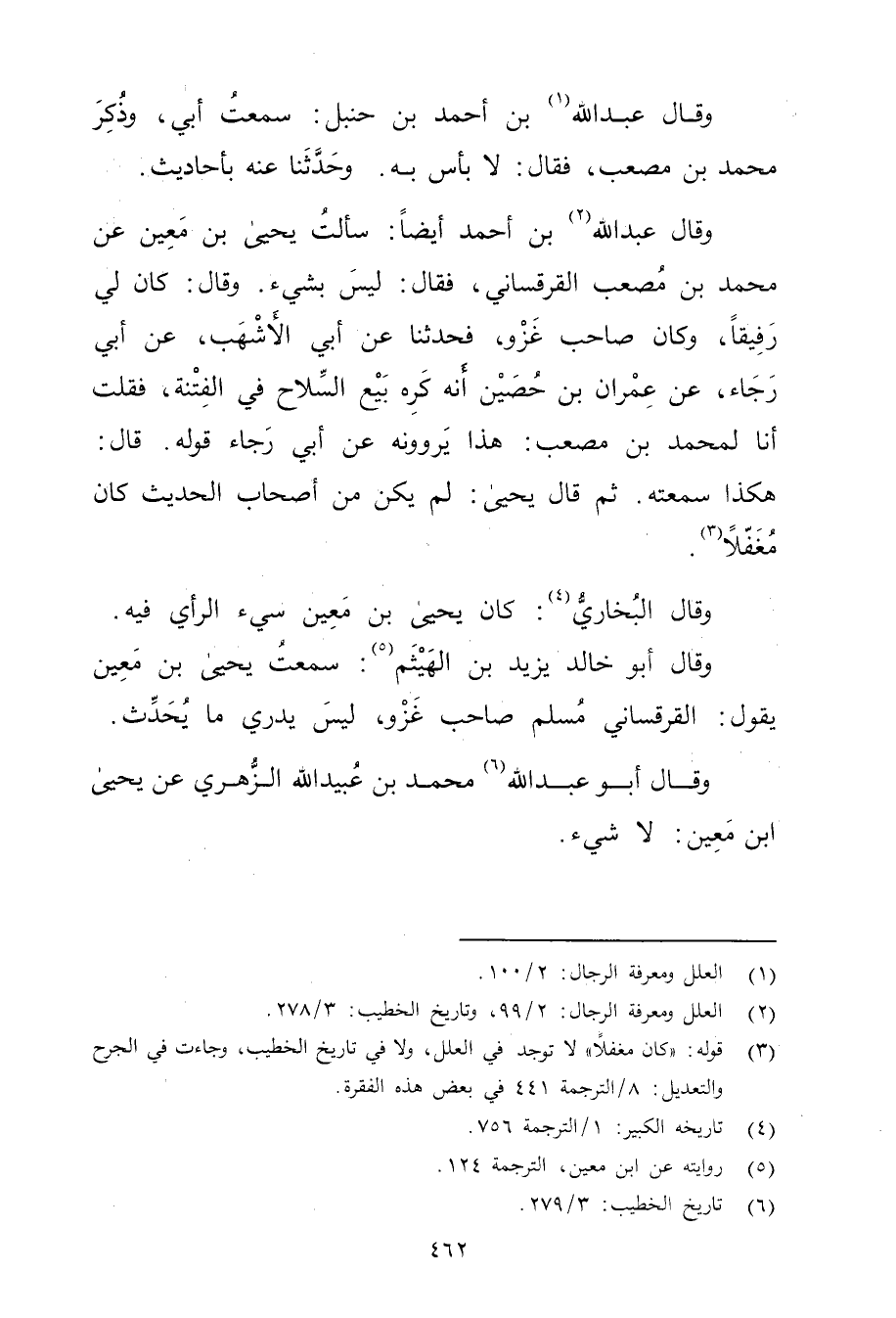 (2) العلل ومعرفة الرجال: 2 / 99، وتاريخ الخطيب: 3 / 278.