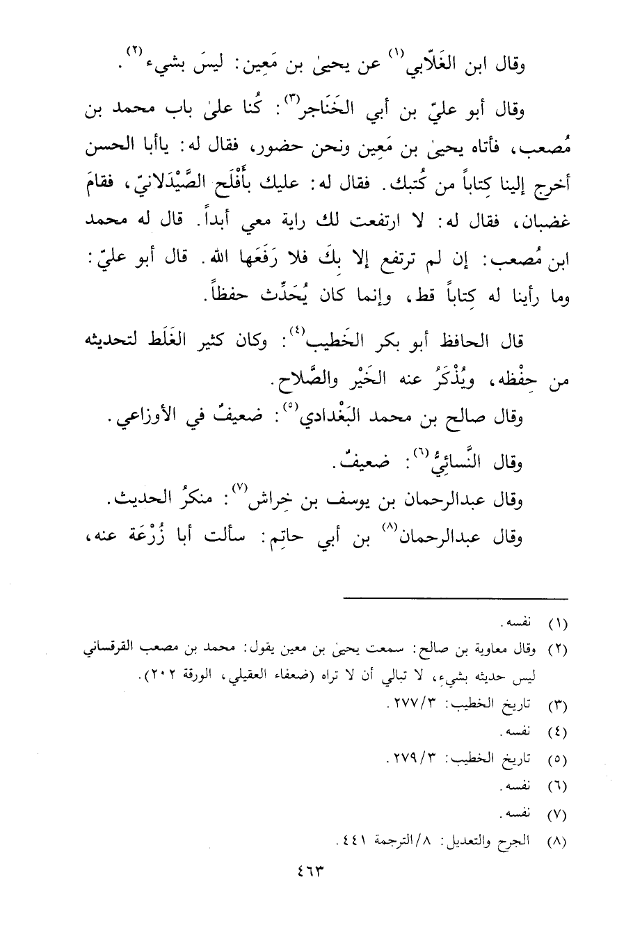 (2) وَقَال معاوية بن صالح: سمعت يَحْيَى بْن مَعِين يَقُول: مُحَمَّد بن مصعب القرقساني ليس حديثه بشيءٍ، لا تبالي أن لا تراه (ضعفاء العقيلي، الورقة 202) .