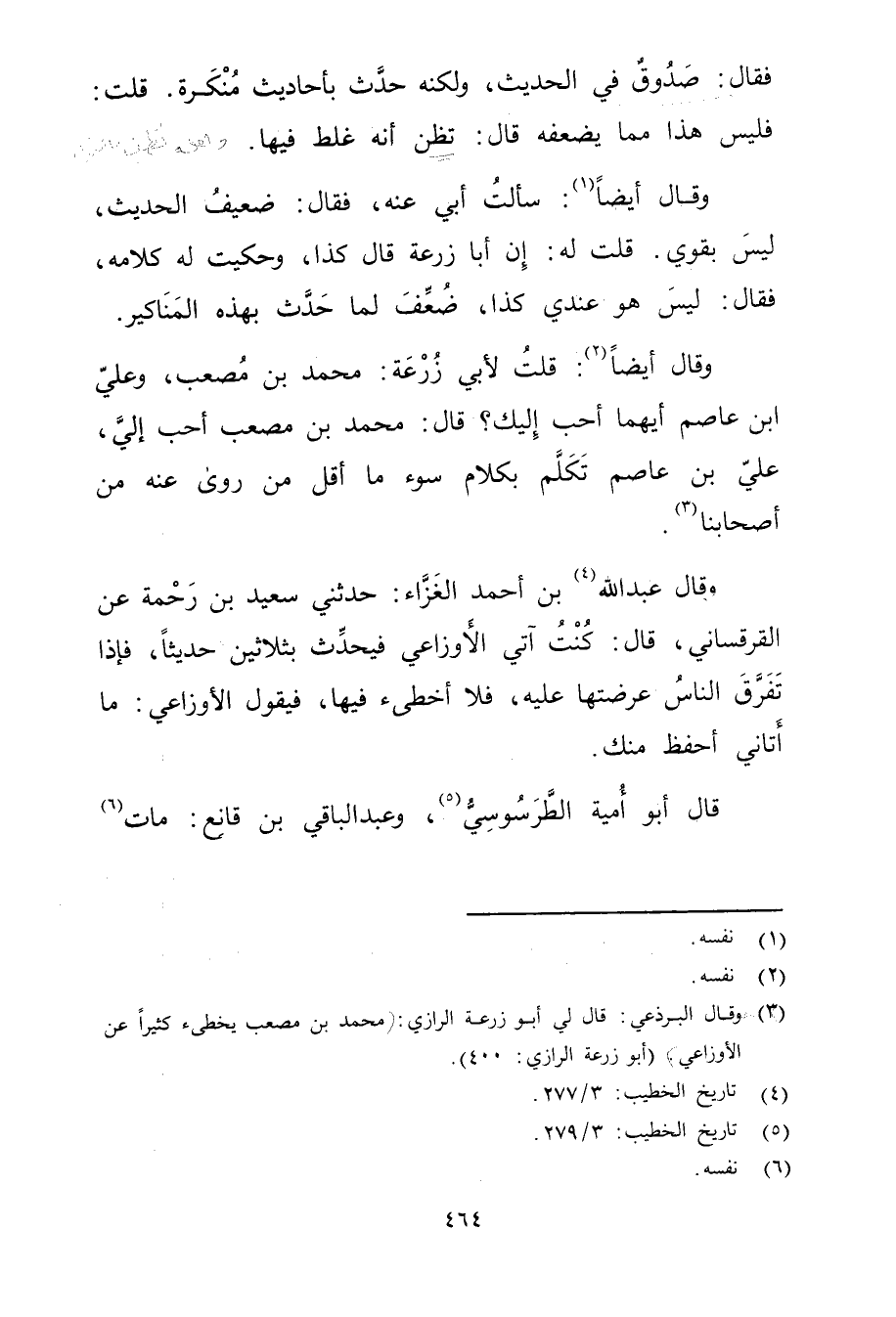 (3) وَقَال البرذعي: قال لي أَبُو زُرْعَة الرازي: محمد بن مصعب يخطئ كثيرا عن الأَوزاعِيّ.