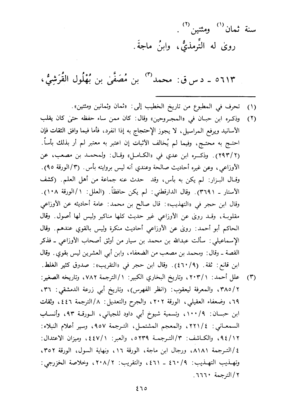 (3) علل أحمد: 1 / 203، وتاريخ البخاري الكبير: 1 / الترجمة 782، وتاريخه الصغير: 2 / 385، والمعرفة ليعقوب:،، وتاريخ أبي زرعة الدمشقي: 36، 69، وضعفاء العقيلي، الورقة 202، والجرح والتعديل: 8 / الترجمة 446، وثقات ابن حبان: 9 / 100، وتسمية شيوخ أبي داود للباجي، الورقة 93، وأنساب السمعاني: 4 / 221، والمعجم المشتمل، الترجمة 957، وسير أعلام النبلاء: 12 / 94، والكاشف: 3 / الترجمة 5239، والعبر: 1 / 447، وميزان الاعتدال: 4 / الترجمة 8181، ورجال ابن ماجة، الورقة 16، ونهاية السول، الورقة 352، وتهذيب التهذيب: 9 / 460 - 461، والتقريب: 2 / 208، وخلاصة الخزرجي: 2 / الترجمة 6660.