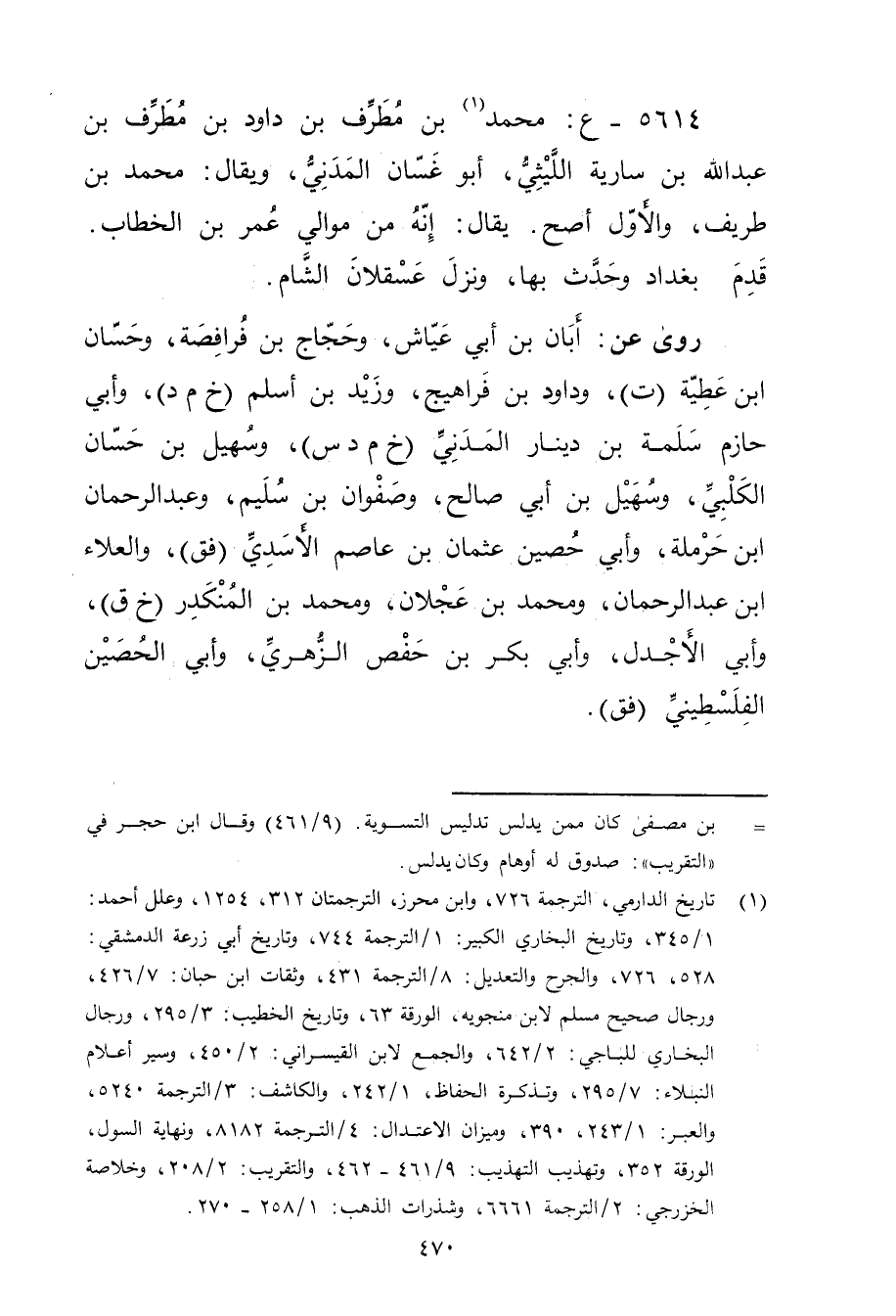 5614 - ع: مُحَمَّد بن مطرف بن داود بن مطرف بن عَبد اللَّهِ بن سارية الليثي (1) ، أَبُو غسان المدني، ويُقال: مُحَمَّد بن طريف، والأول أصح، يُقَال: إنه من موالي عُمَر بن الخطاب.