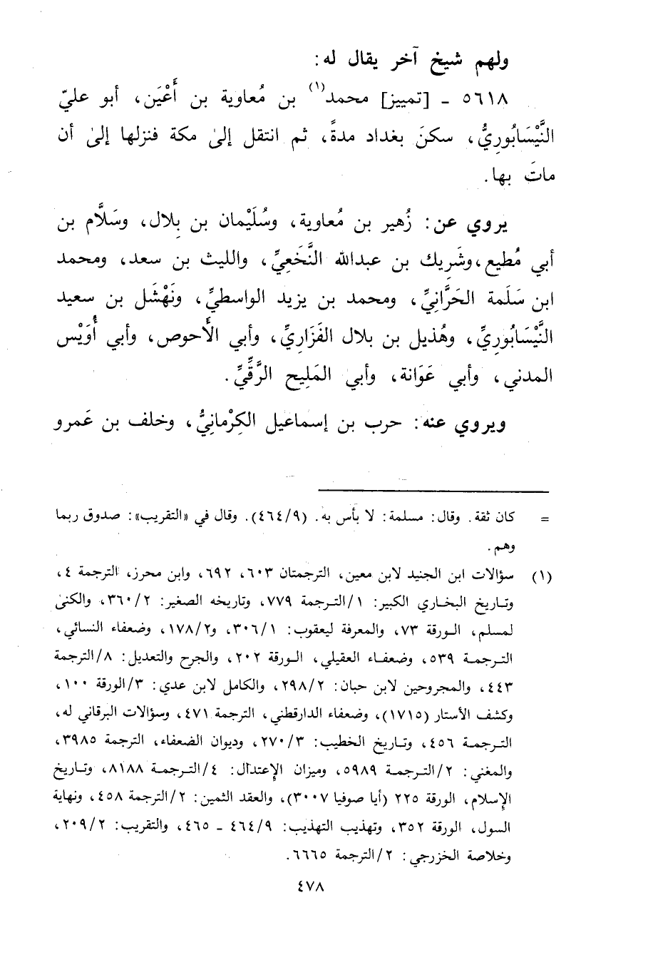5618 - (تمييز) مُحَمَّد بن معاوية بن أعين (1) ، أَبُو علي النيسابوري، سكن بغداد مدة، ثم انتقل إلى مكة فنزلها إلى أن مات بها.