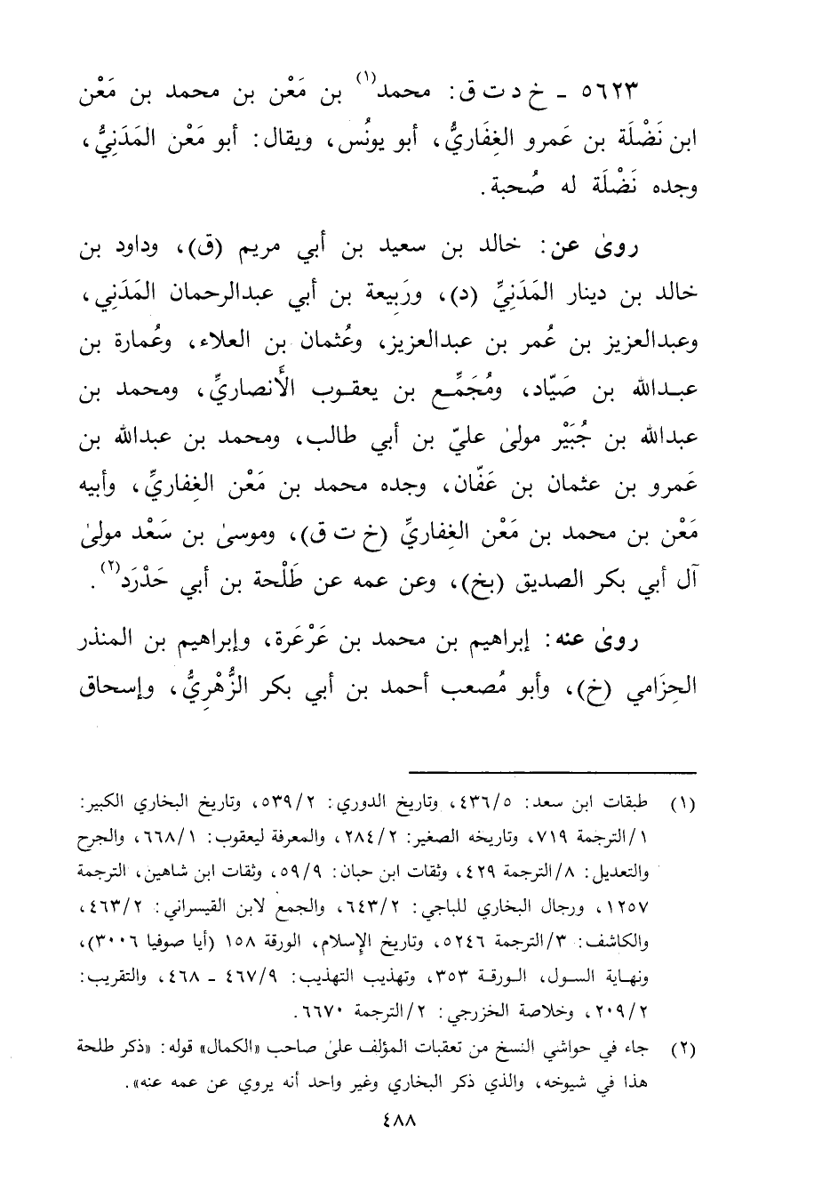 5623 - خ د ت ق: مُحَمَّد (1) بْنُ مَعْنِ بْنِ مُحَمَّدِ بْنِ معن ابن نضلة بن عَمْرو الغفاري، أَبُو يونس، ويُقال: أَبُو معن المدني، وجده نضلة له صحبة.