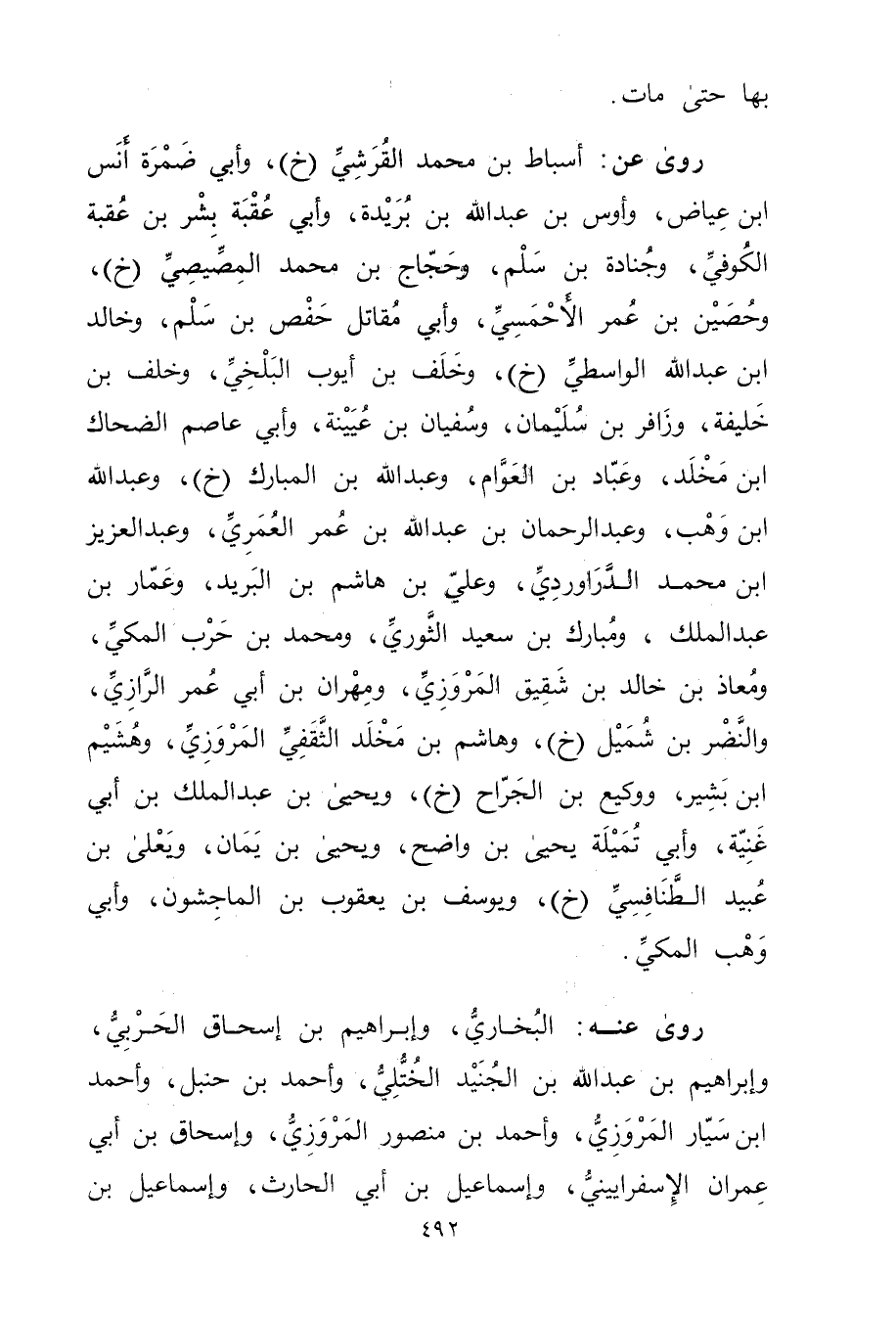 رَوَى عَن: أسباط بن مُحَمَّد القرشي (خ) ، وأبي ضمرة أنس ابن عياض، وأوس بن عَبد اللَّهِ بن بريدة، وأبي عقبة بشر بن عقبة الكوفي، وجنادة بن سلم، وحجاج بن مُحَمَّد المصيصي (خ) ، وحصين بن عُمَر الأحمسي، وأبي مقاتل حفص بن سلم، وخالد ابن عَبد اللَّهِ الواسطي (خ) ، وخلف بن أيوب البلخي، وخلف بن خليفة وزافر بن سُلَيْمان، وسفيان بْن عُيَيْنَة، وأَبِي عاصم الضحاك ابن مخلد، وعباد بن العوام، وعَبد اللَّه بْن المبارك (خ) ، وعَبد الله بْن وهب، وعبد الرحمن بْن عَبد اللَّهِ بْن عُمَر العُمَري، وعبد العزيز ابن مُحَمَّد الدَّراوَرْدِيّ، وعلي بْن هاشم بن البريد، وعمار بن عَبد المَلِك، ومبارك بن سَعِيد الثوري، ومحمد بن حرب المكي، ومعاذ بن خالد بن شقيق المروزي، ومهران بْن أَبي عُمَر الرازي، والنضر بن شميل (خ) ، وهاشم بن مخلد الثقفي المروزي، وهشيم ابن بشير، ووكيع بن الجراح (خ) ، ويحيى بْن عَبد المَلِك بْن أَبي غنية، وأبي تميلة يحيى بن واضح، ويحيى بن يمان، ويَعْلَى بْن عُبَيد الطنافسي (خ) ، ويوسف بْن يعقوب بن الماجشون، وأبي وهب المكي.