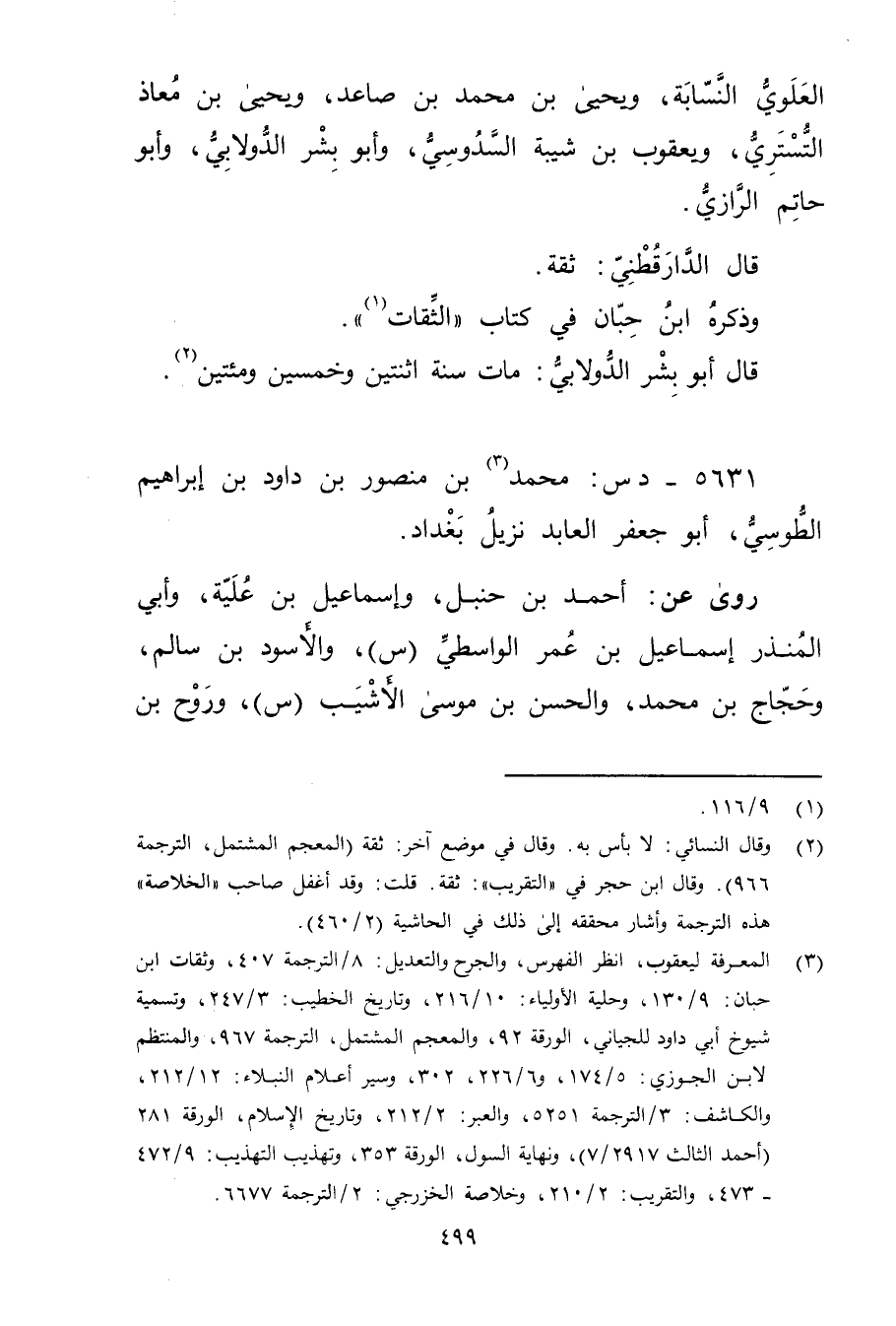 (3) المعرفة ليعقوب، انظر الفهرس، والجرح والتعديل: 8 / الترجمة 407، وثقات ابن حبان: 9 / 130، وحلية الاولياء: 10 / 216، وتاريخ الخطيب: 3 / 247، وتسمية شيوخ أبي داود للجياني، الورقة 92، والمعجم المشتمل، الترجمة 967، والمنتظم لابن الجوزي: 5 / 174، و6 / 226، 302، وسير أعلام النبلاء: 12 / 212، والكاشف: 3 / الترجمة 5251، والعبر: 2 / 212، وتاريخ الاسلام، الورقة 281 (أحمد الثالث 2917 / 7) ، نهاية السول، الورقة 353، وتهذيب: 9 / 472 - 473، والتقريب: 2 / 210، وخلاصة الخزرجي: 2 / الترجمة 6677.
