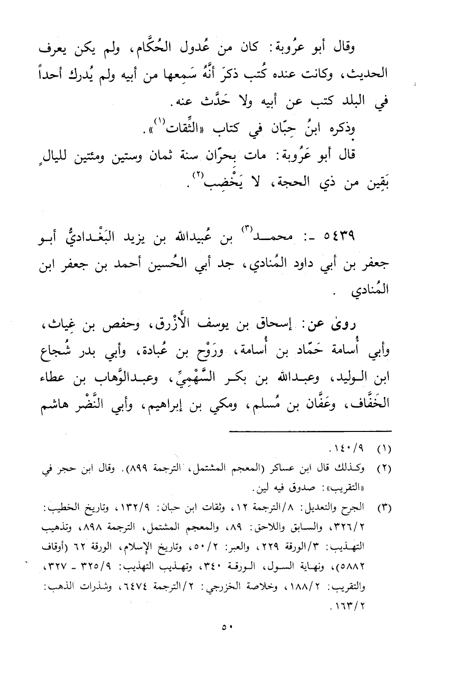 5439 - مُحَمَّد بن عُبَيد الله بن يزيد البغدادي أَبُو جعفر بن أَبي داود المنادي (3) ، جد أبي الحسين أَحْمَد بن جعفر ابن المنادي.