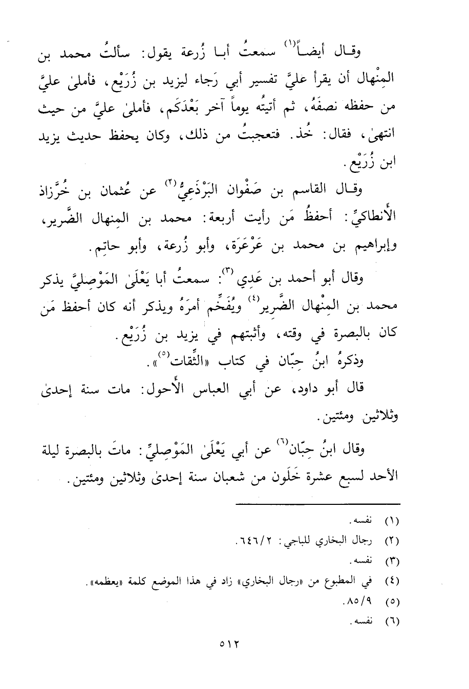 وَقَال أَبُو أحمد بن عدي (3) : سمعت أبا يَعْلَى الموصلي يذكر مُحَمَّد بن المنهال الضرير (4) ويفخم أمره ويذكر أنه كان أحفظ من كان بالبصرة في وقته، وأثبتهم في يزيد بن زريع.